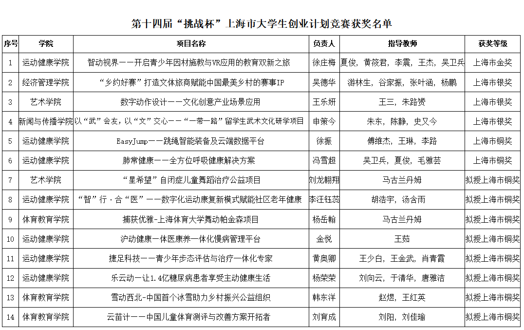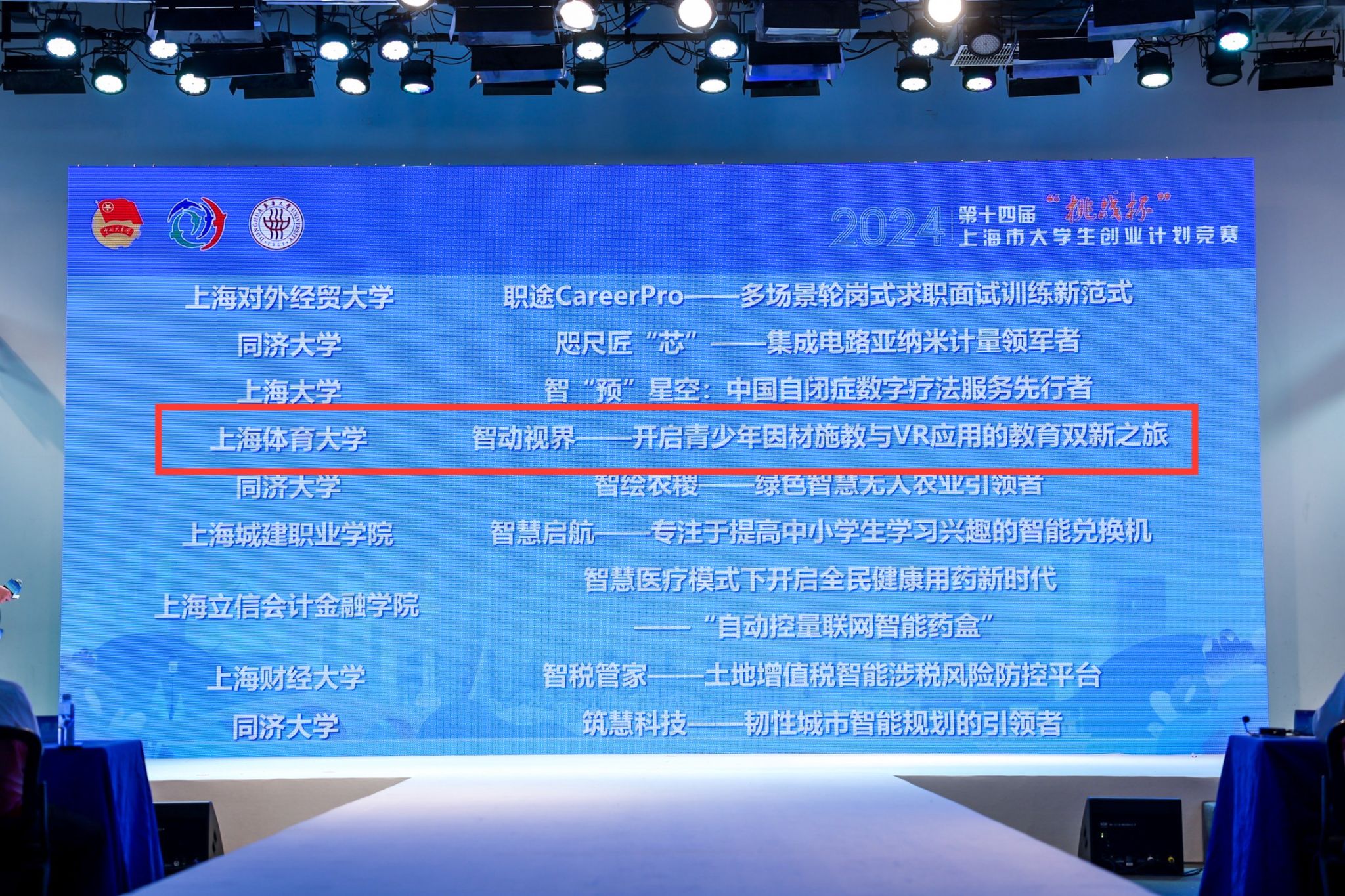 本次大赛规模空前,共吸引来自80余所院校的6.8万名学生参赛,累计提交2.5万个创新创业项目,其中共有74家学校的1131个项目进入第十四届“挑战杯”上海市大学生创业计划竞赛市级复赛。经专家评审,共有358个项目入围市级决赛。通过线下答辩,最终,我校来自运动健康学院的项目《智动视界——开启青少年因材施教与VR应用的教育双新之旅 》斩获上海市赛金奖。