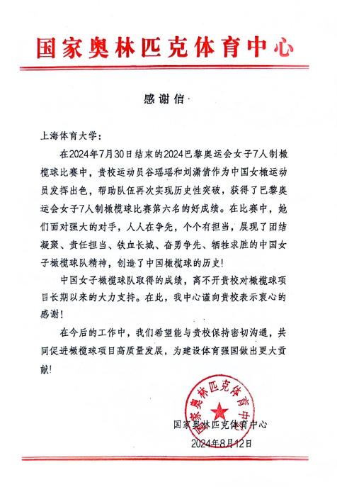 近日,我校收到国家奥林匹克体育中心的感谢信,以此感谢我校运动员刘潇倩、谷瑶瑶作为橄榄球绝对主力为国家队实现突破作出重要贡献。