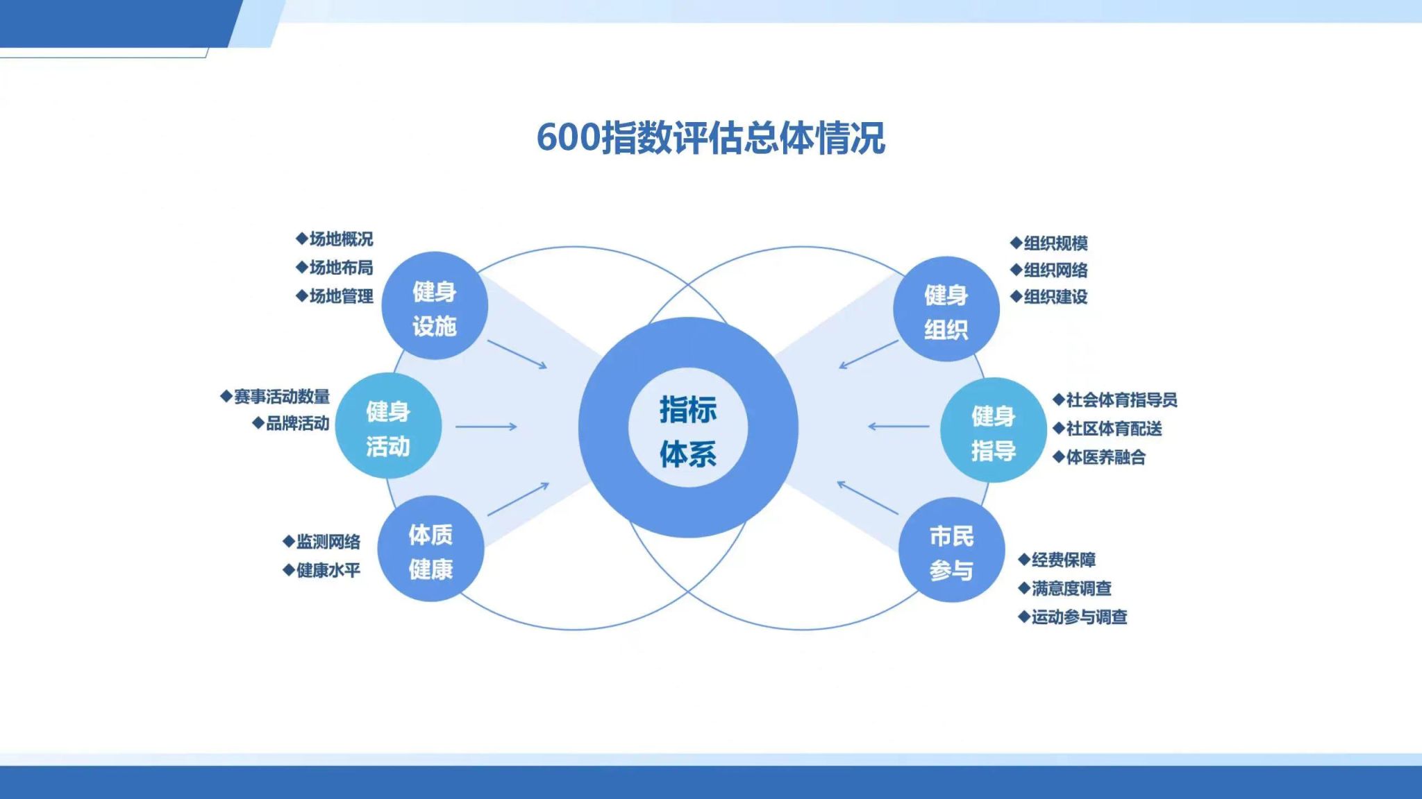 上海市全民健身发展600指数由“健身设施”“健身组织”“健身活动”“健身指导”“体质健康”以及“市民参与”六个单项指数构成。《2023上海市全民健身发展报告》显示,上海全民健身600指数总分为486.7,指数总体较高。其中“体质健康”指数最高,“健身设施”指数最低,“健身指导”较上一年度进步明显。上海市持续构建更高水平的全民健身公共服务体系,本市市民经常参与体育锻炼的比例持续提升,市民总体健康水平良好,市民满意度稳步提升。