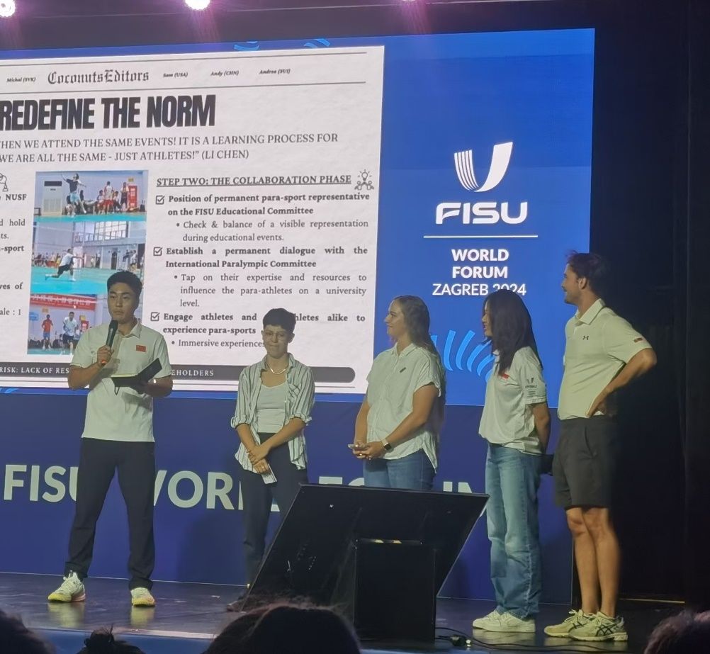在论坛演讲环节,按照组委会的分组安排,我校学生和来自其他国家和地区的学生围绕推进残疾人大学生运动、构建FISU国际交流合作网络等作了专题报告。