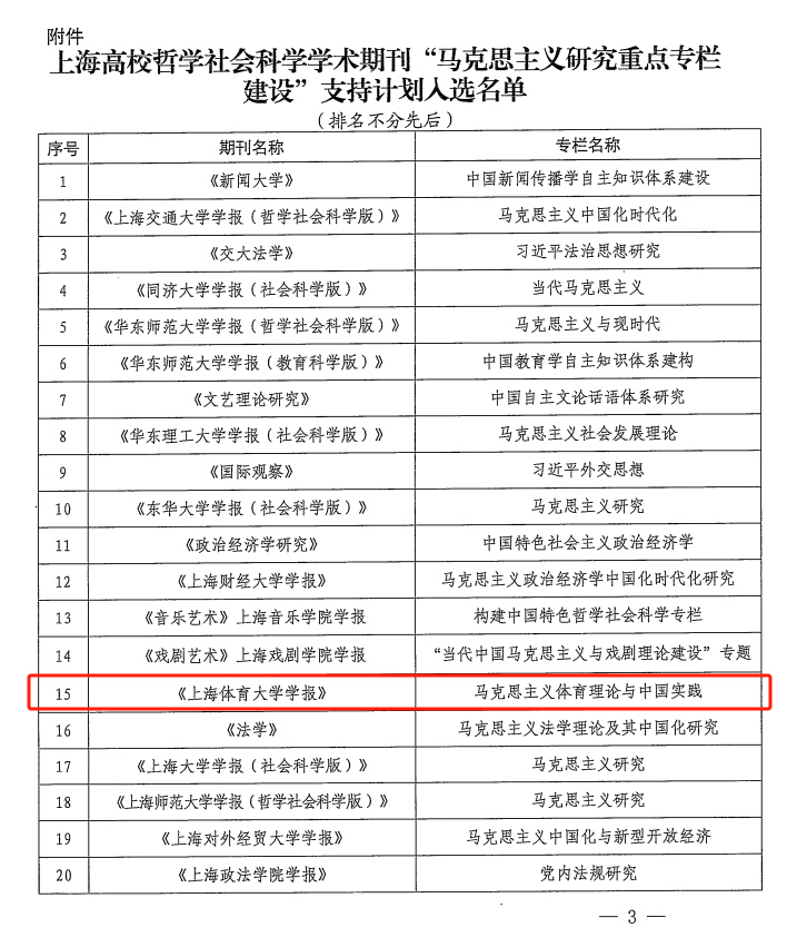 本网讯 近日,中共上海市教育卫生工作委员会、上海市教育委员会公布了上海高校哲学社会科学学术期刊“马克思主义研究重点专栏建设”支持计划入选名单,全市共有20家期刊入选。我校主办的《jnh今年会网站学报》“马克思主义体育理论与中国实践”专栏成功入选。