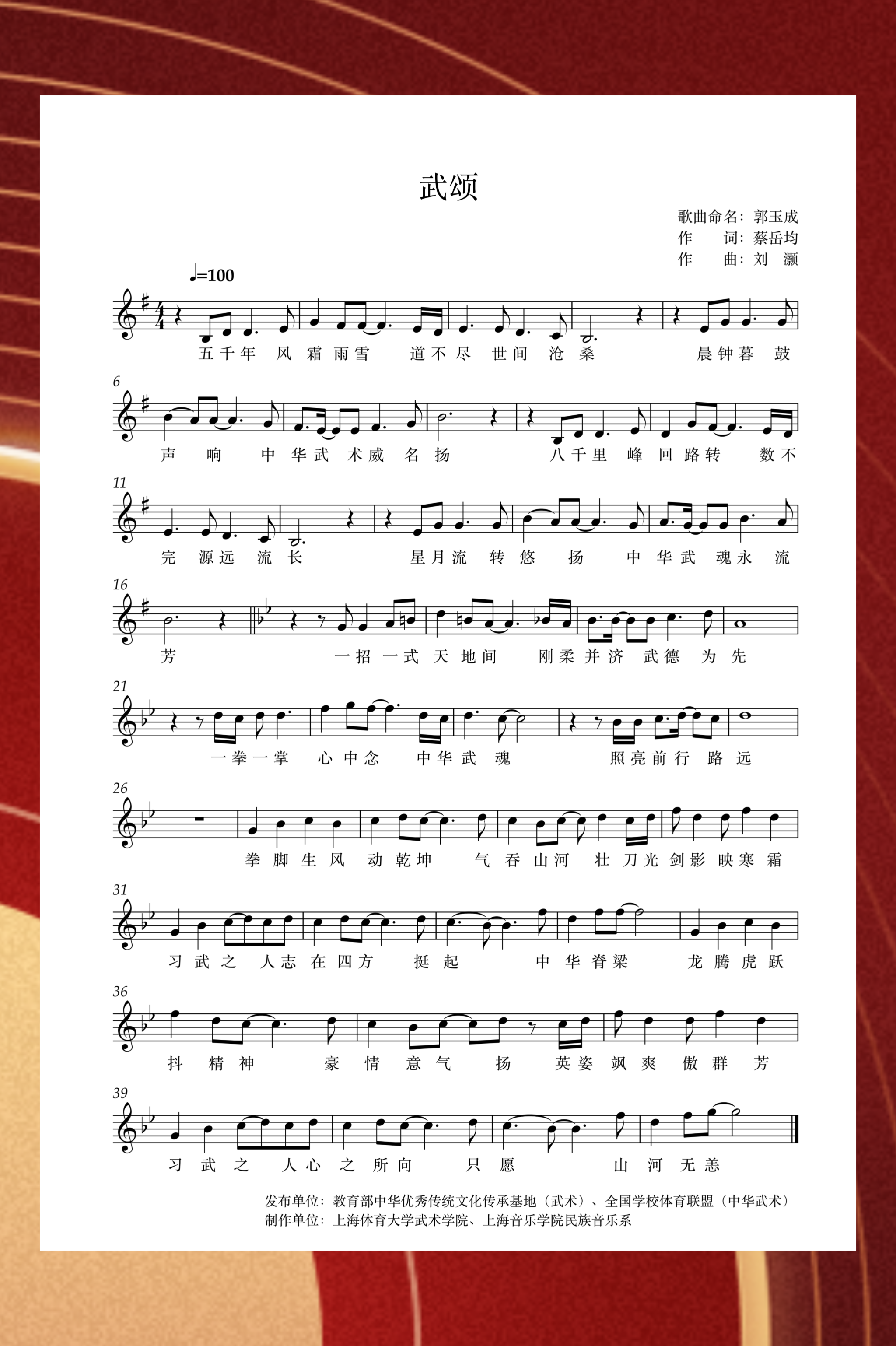 《武颂》由jnh今年会网站武术学院院长郭玉成教授命名,上海音乐学院民族音乐系主任刘灏教授团队作词作曲,以习近平文化思想为引领,将中华武术与爱国主义教育、民族精神培育融汇于词曲创作之中,着力举精神之旗、立精神之柱、建精神家园。歌曲气势恢宏、催人奋进,充分展现了中华武术的沧桑厚重,及其与国家和民族前途命运的紧密联系,唱出了一腔壮志、催生了一股精神、展现了一襟气节、激发了一种力量,为广大青少年增强了做中国人的志气、骨气、底气。