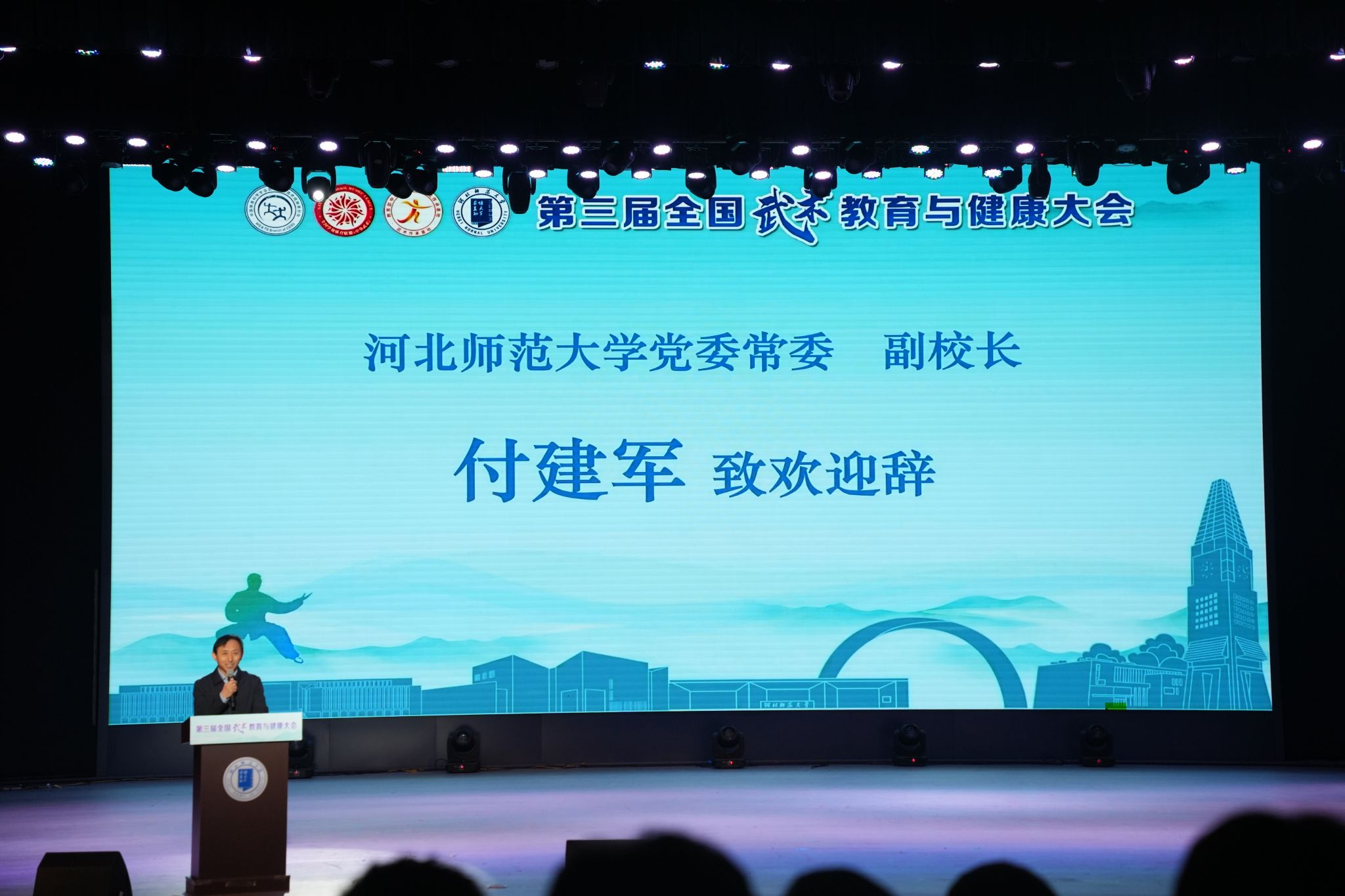 付建军在欢迎辞中指出,河北师范大学是河北省人民政府与教育部共建的省属重点骨干大学,河北省“双一流”建设一层次高校。河北师范大学将以此次大会为契机,以具有93年的体育办学史为底蕴,发挥河北省唯一的“体育学”一级学科博士和硕士学位授权点、博士后科研流动站的学科优势,深入推进武术教育与教学改革,完善课程体系建设、强化师资队伍力量、以培养高素质的武术人才为目标,积极为弘扬中华优秀传统文化与增强文化自信贡献力量,努力打造武术教育品牌与特色。他表示,学校将通过创新教学模式与课程设计,推动武术教育的现代化进程,积极探索武术在弘扬中国传统文化、健康促进等领域的实践与应用,让武术成为树立文化自信、促进全民健身、提升国民健康水平的重要载体。
