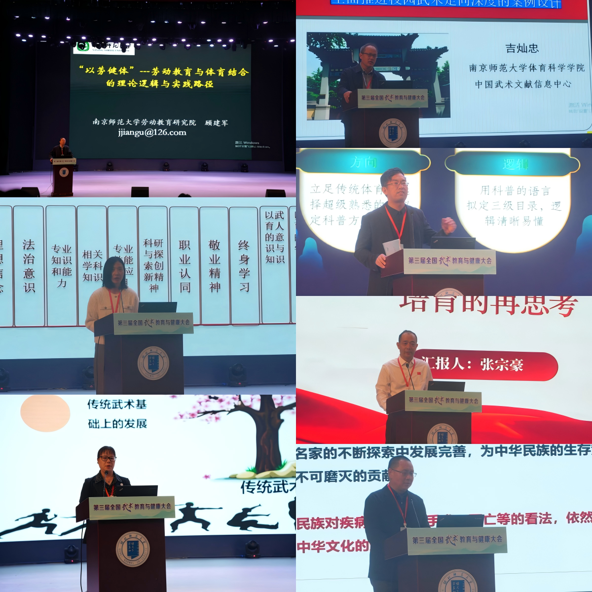在为期两天的会议中,大会设立了大会报告、分会场专题报告、墙报交流和书面交流四种形式,紧密围绕会议主题展开深入交流,为专家和学者提供广泛的交流平台。大会内容丰富,研讨成果丰硕。南京师范大学教育科学学院教授顾建军在大会上做了《以劳健体——谈谈劳动教育与体育结合的理论逻辑与实践路径》的大会主报告。他从生动活泼的案例入手,逐步过渡至深邃的基础理论逻辑,增智、树德、益美、强体,然后再转回至实践探索,提出劳动教育与体育结合坚持“四个度”——深度、强度、精度、限度,并用生动的实例佐证说明,使本为枯燥的理论活脱而又印象深刻。大会还邀请了jnh今年会网站丁丽萍教授、浙江大学林小美教授、南京师范大学吉灿忠教授、中国体育报业总社赵军教授、苏州大学张宗豪教授、上海交通大学王会儒教授分别作题为《武术与民族传统体育专业课程思政建设思路与方案》《守正与创新——竞技武术套路技术新变化》《全面推进校园武术走向深度的案例设计》《民族传统体育科普申报国家社科项目》《学校武术助力青少年家国情怀培育的再思考》《武术与民族传统体育传承与传播的“返本开新”》的报告,分享了有关武术教育中的课程思政建设应达成共识并分层实施、竞技武术套路以技击为本质推动其入奥与多元化发展、校园应全面传承传统武术、多模态平台促进民族传统体育科普与智慧化发展、武术教育应培养家国情怀、以“文化铸魂、技术赋能”传承与传播武术,引发了诸多学者的兴趣与思考。