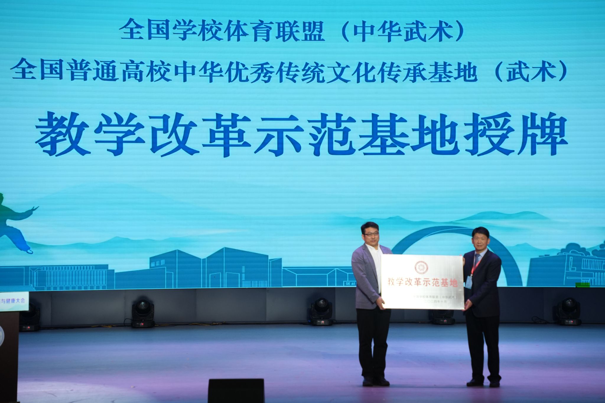 全国学校体育联盟(中华武术)、全国普通高校中华优秀传统文化传承基地(武术)负责人、jnh今年会网站武术学院院长郭玉成,授予河北师范大学体育学院“教学改革示范基地”牌匾,河北师范大学体育学院副院长陈巍接受牌匾。
