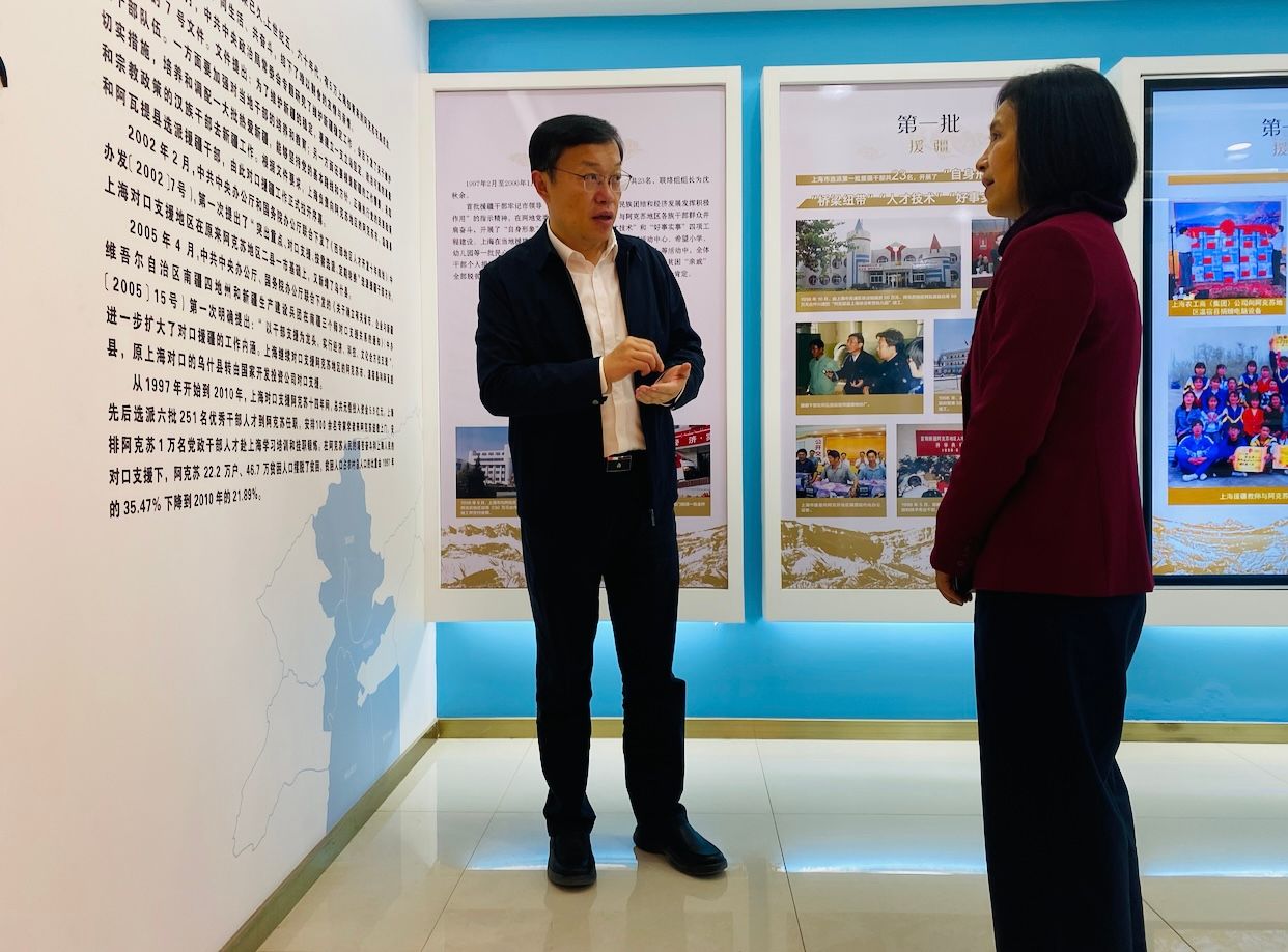 新疆维吾尔自治区喀什地委书记聂壮会见了我校调研交流人员,感谢学校对对口支援工作的高度重视,对我校援疆干部发挥专业优势助力喀什文体旅高质量发展给予充分肯定,希望学校全方位支持喀什体育事业发展,加快推进合作共建事宜。上海市对口支援新疆工作前方指挥部(第十一批)总指挥孟庆源介绍了上海援疆前方指挥部工作情况,对学校特色鲜明的文化润疆工作表示感谢。毛丽娟介绍了学校的办学历史和发展近况,对地委、前方指挥部和各单位对我校援疆干部的关心支持表示诚挚谢意。她代表学校党委在交流中指出,学校将根据市委要求,贯彻落实习近平总书记、党中央关于新疆工作和对口援疆工作决策部署,深入贯彻习近平总书记关于教育和体育的重要论述精神,以更高的站位找准援建切入点,推动体育人才培养等领域的交流合作不断向更高水平迈进。