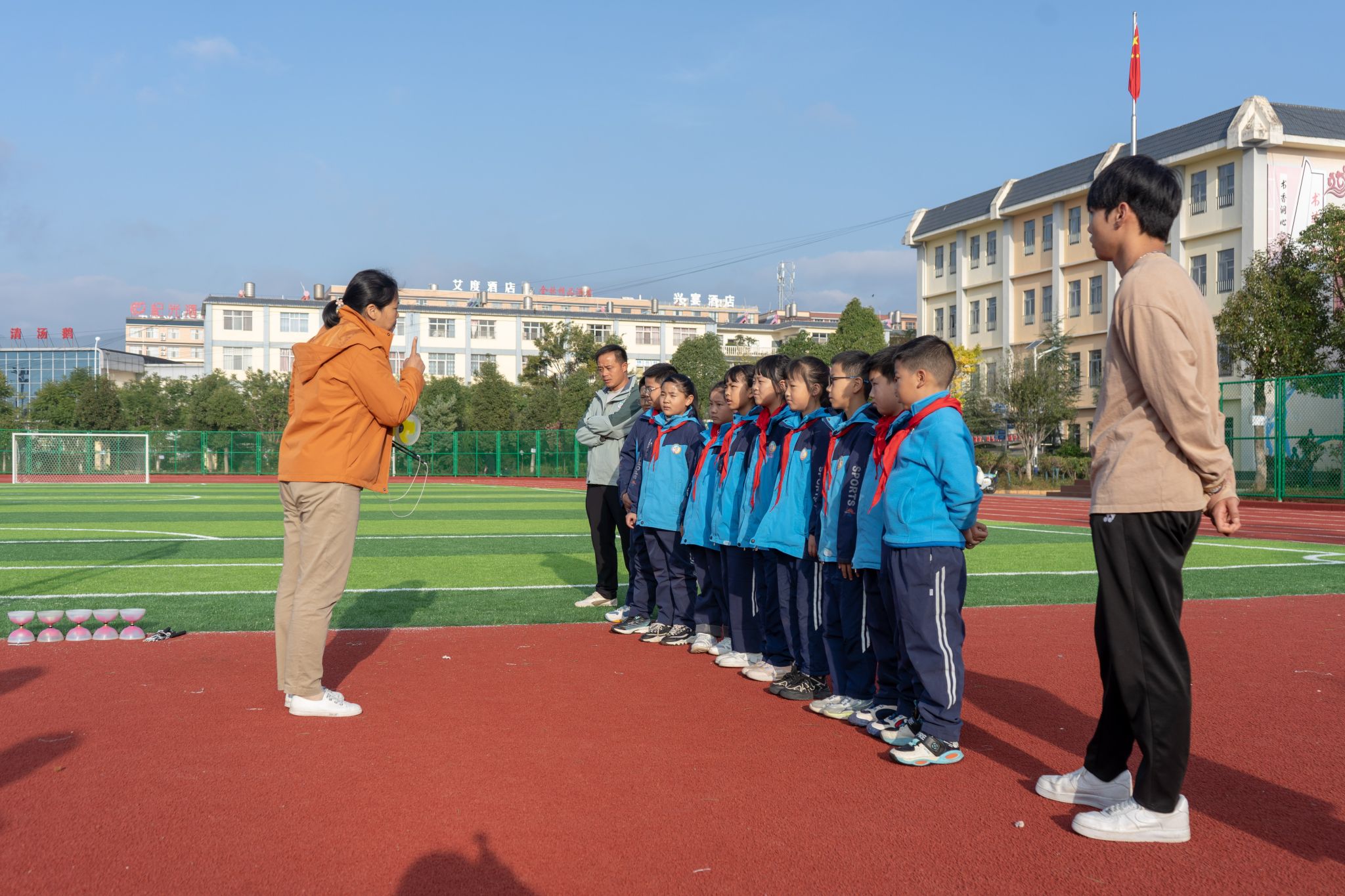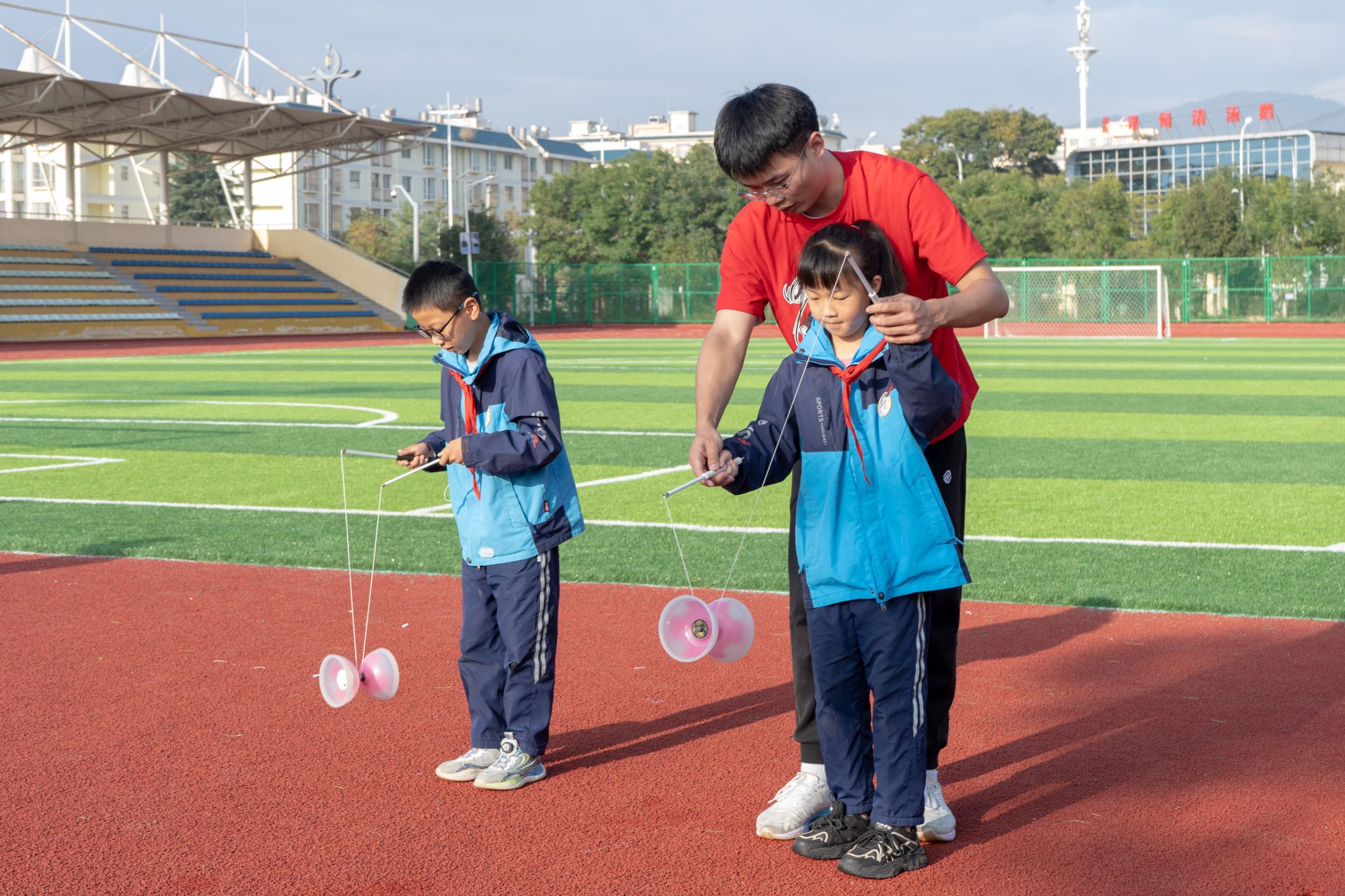 上体师生还走进寻甸仁德一小开展了空竹送教体验活动。仁德一小的体育老师和小学生们在上体师生的指导下,拿起空竹,提、拉、抛、接、抖、转、盘……聚精会神、全身发力,一抛一接之间,逐渐掌握了空竹的玩法。第一次接触空竹的仁德一小师生纷纷表示空竹既好学又好玩,希望空竹这个项目能在当地生根开花,能有更多的人一起参与进来。最后我校师生进行了空竹捐赠仪式,将带去寻甸的十二套空竹设备和相关书籍捐赠给仁德一小,体育教育学院杨小凤老师表示,未来会持续帮助和指导空竹项目落地寻甸仁德一小,让更多的孩子能接触到空竹项目,在感受中华优秀传统体育文化的过程中强身健体、健康成长。