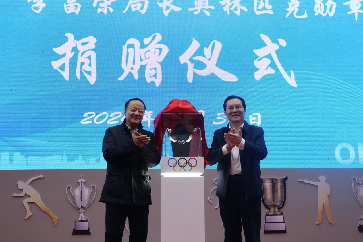 李富荣同沈炜为捐赠藏品“奥林匹克勋章(银质)”揭幕。