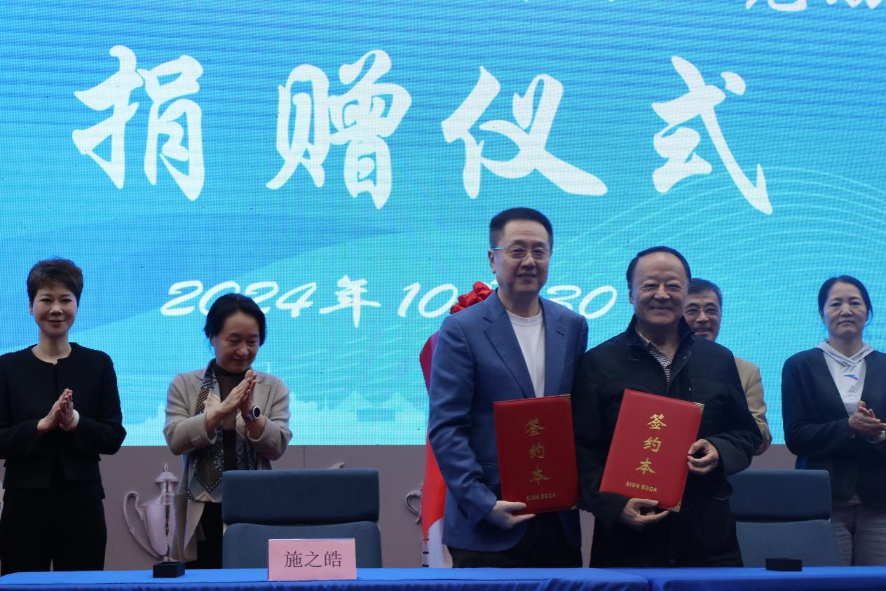 李富荣同施之皓签署捐赠协议,在场嘉宾杨玲、陈一平、陈华、曹燕华、张德英、王根清、楼世和、章建华、乔红和赵荣善见证签约。