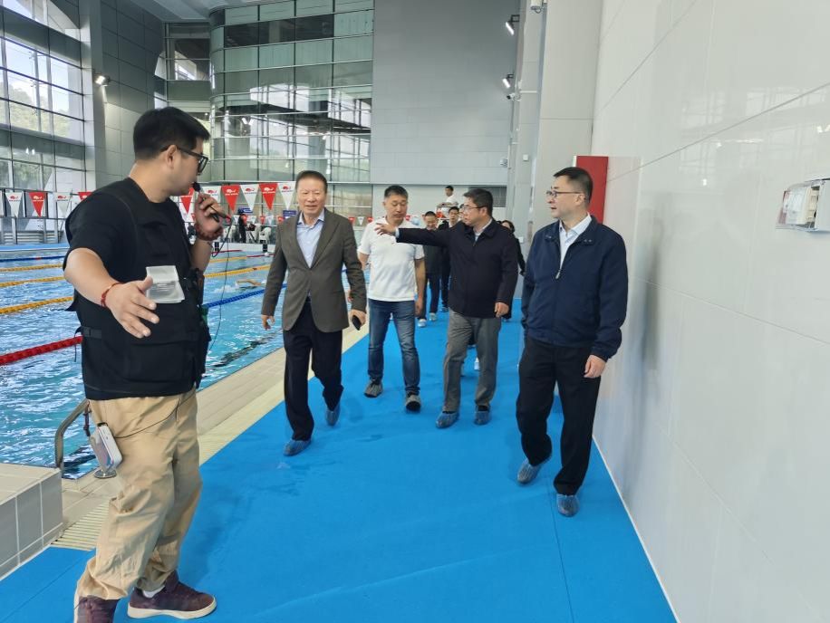 最后,薛侃一行来到杨浦运动健康中心游泳池,领导们仔细查看游泳池设施情况,包括构造、水质、安全防护设施等,并询问经营者游泳池日常运营状况,如开放时间、客流量、安全保障措施落实情况等。