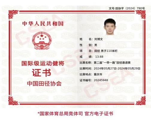 本网讯 11月11日,经国家体育总局竞体司批准,我校竞技运动学院22级本科生刘博文正式被授予“男子110米栏国际级运动健将”称号。