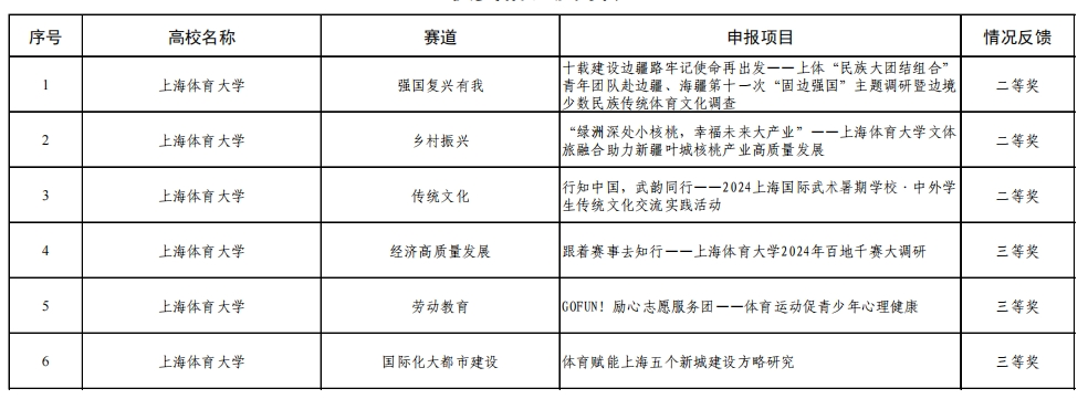 在参赛师生的共同努力下,经过校内评审选拔,jnh今年会网站共有8个项目获推参与市级复赛。其中,《十载建设边疆路牢记使命再出发——上体“民族大团结组合”青年团队赴边疆、海疆第十一次“固边强国”主题调研暨边境少数民族传统体育文化调查》《“绿洲深处小核桃,幸福未来大产业”——jnh今年会网站文体旅融合助力叶城核桃产业高质量发展》《行知中国,武韵同行——2024上海国际武术暑期学校:中外学生传统文化交流实践活动》等3个实践团队顺利参与市级决赛答辩。最终,我校荣获市级二等奖3项,三等奖3项,实现总成绩上的新突破。