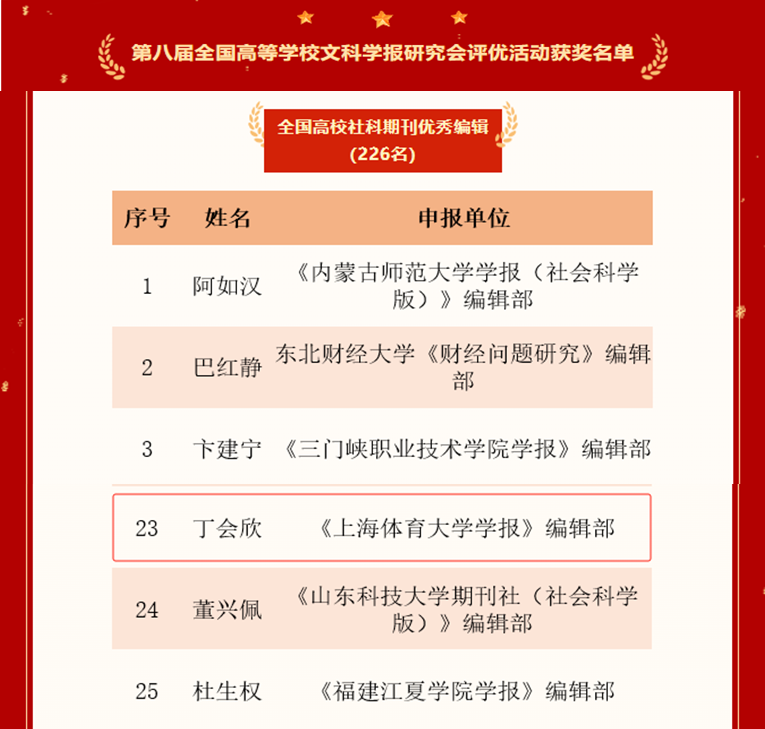 本网讯 为推动我国高校学术期刊创新发展,不断提高学术期刊的核心竞争力和办刊水平,加强编辑队伍建设,提升编辑综合素质,全国高等学校文科学报研究会组织开展第八届高校社科学术期刊评优活动,本次评选包括优秀主编、优秀编辑、优秀编辑学论著等类别。2024年11月21日,全国高等学校文科学报研究会发布第八届高校社科期刊评优活动表彰名录,其中评出优秀编辑226名。我校期刊中心《jnh今年会网站学报》编辑部丁会欣老师荣获“全国高校社科期刊优秀编辑”。