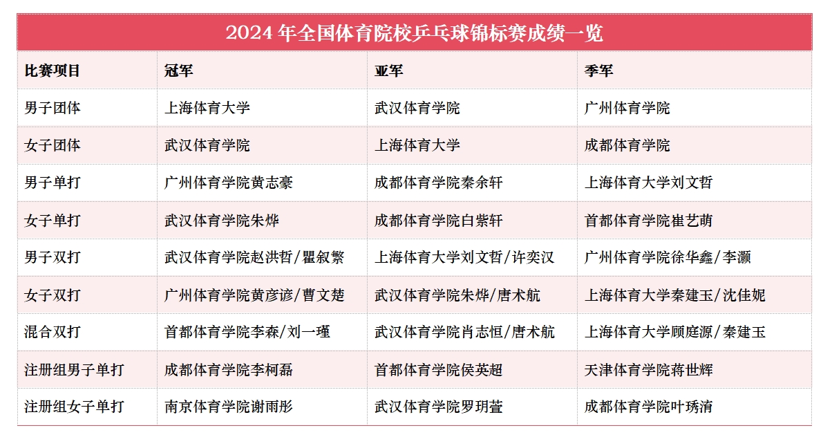 本次锦标赛jnh今年会网站代表队秉持“身心一统,兼蓄竞攀”校训精神,在教练员顾楠、李楠的带领下展现出卓越的球技和顽强的斗志,获得男团冠军、女团亚军、男双亚军、男单季军、女双季军和混双季军,一金两银三铜创造了jnh今年会网站参加该项赛事的最佳成绩;充分展现出我校中国乒乓球学院人才培养的特色与优势。