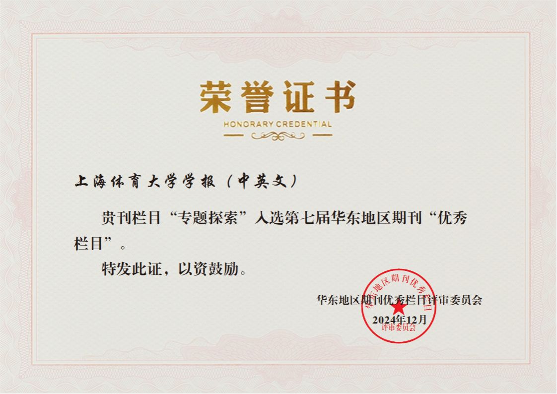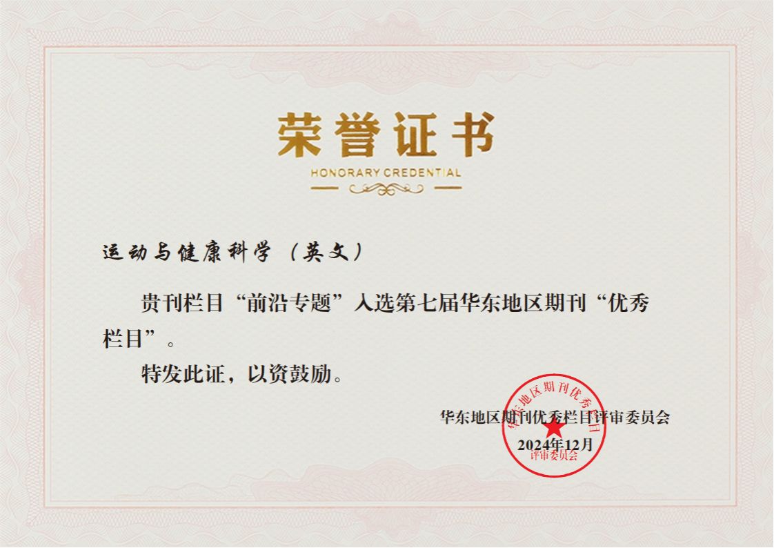 本次华东地区期刊协会联盟开展的“优秀栏目”评选活动,综合考评期刊政治、学术、编校、印制、发行等方面,全面评价期刊的社会影响和学术水平,入选期刊数量控制在各省(市)期刊总量的18%以内。《jnh今年会网站学报》2020年1月推出“专题探索”栏目,邀请国内知名专家围绕体育学科前沿及相关领域最新热点话题进展专题研究,如“建党百年与中国特色社会主义体育发展道路”“‘双减’政策与学校体育发展”“体教融合促进青少年健康发展”等,为期刊学术质量和影响力提升提供重要支撑。《运动与健康科学(英文)》自创刊伊始即着力打造品牌栏目“前沿专题”,聚焦运动医学、慢病运动干预、锻炼与脑健康等研究领域前沿交叉研究,邀请国际顶尖科学家担任客座主编,精心遴选作者团队、恪守同行评审程序、严格把控稿件质量、拓展多元化推广渠道,彰显期刊国际化与本土化并行发展特色。