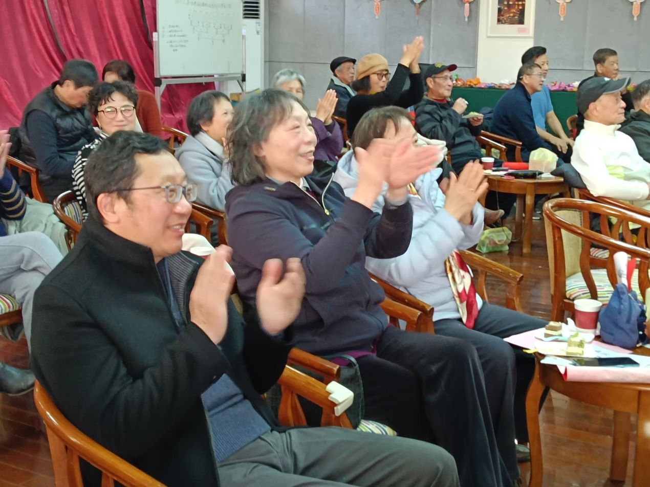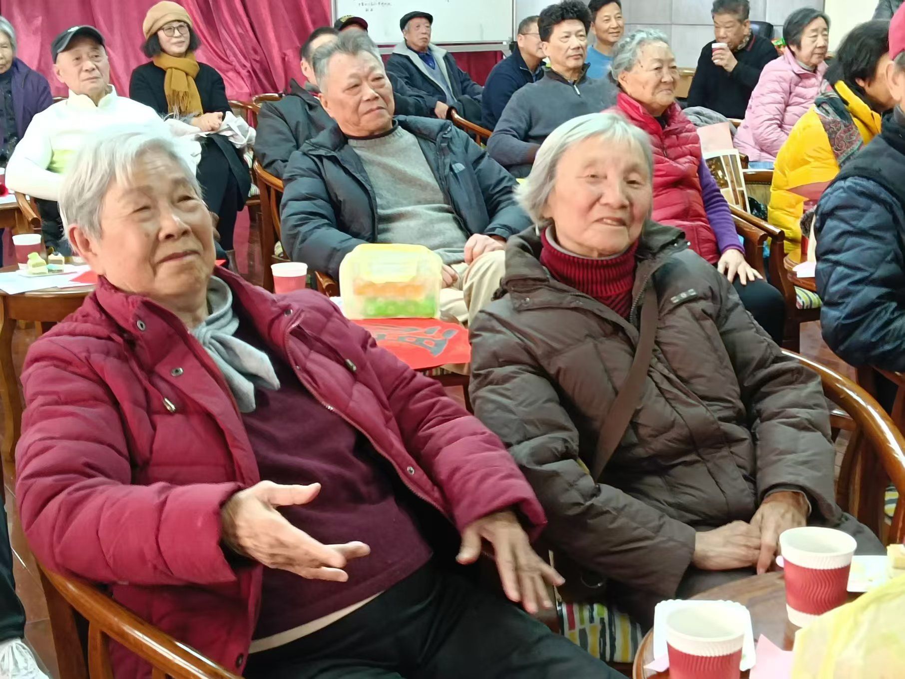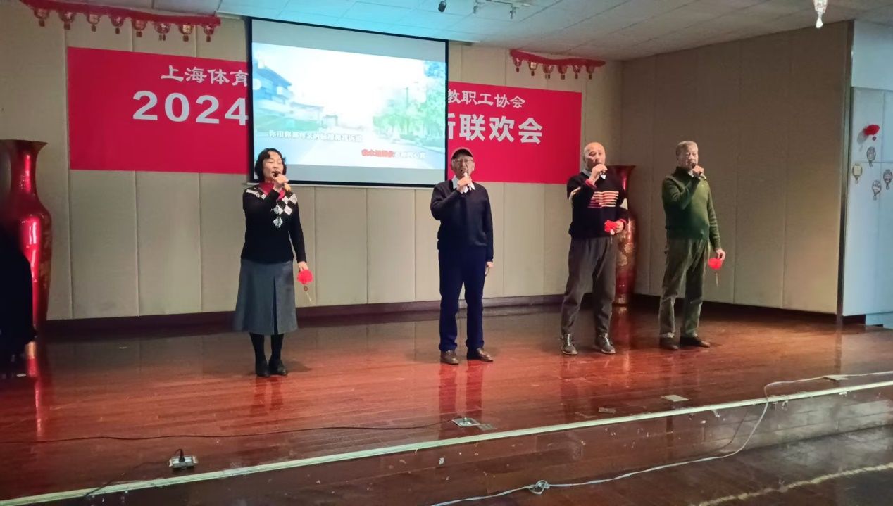 退管会常务副主任李芳应邀出席。年会由协会秘书长黄顺章主持。联欢会为会员自娱自乐活动,由文体协会副会长龚依琴主持。活动有套圈、扑克牌、猜谜语等,会员根据自己的喜好选择参加。会场内有茶歇,志愿者们将可口的热饮和精致小点心送到参会者桌前,边看节目、边品茶。诗朗诵结束,突然间,《我和我的祖国》音乐响起,方立、王秉尧、成万祥、宋佩成四位老师,随着音乐节奏,从会场边上慢慢地走上舞台,全场人员顿时惊讶,这时他们的歌声响彻整个会场,台上、台下随着节拍一起歌唱,把联欢会推向高潮!此节目由龚依琴编导。