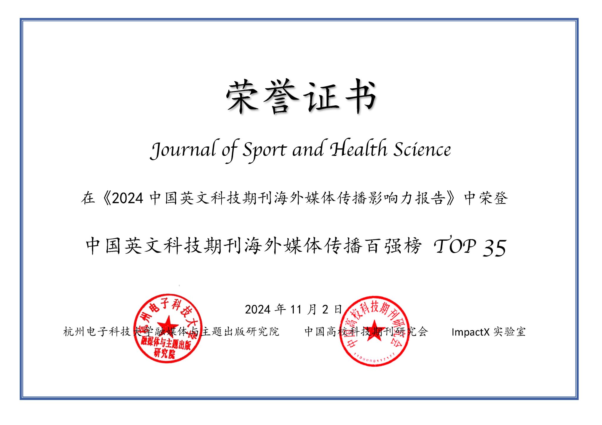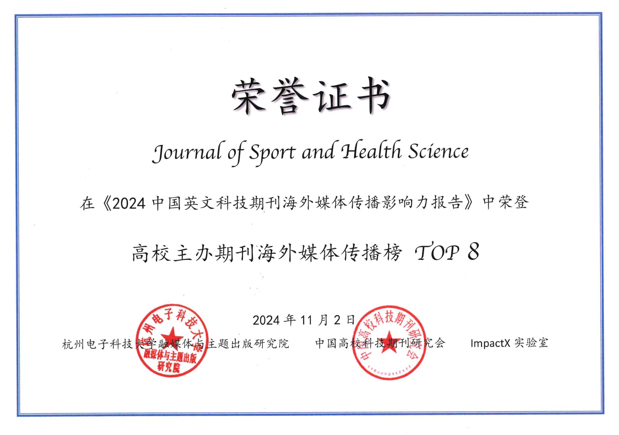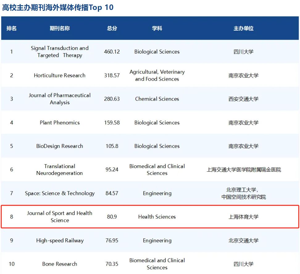 本网讯 近日,《2024中国英文科技期刊海外媒体传播影响力报告》正式发布,我校主办的《运动与健康科学(英文)》(Journal of Sport and Health Science, JSHS)在“中国英文科技期刊海外媒体传播百强榜单”位列第35,成为Health Sciences领域唯一入选期刊,并在“高校主办期刊海外媒体传播Top 10榜单”位列第8。