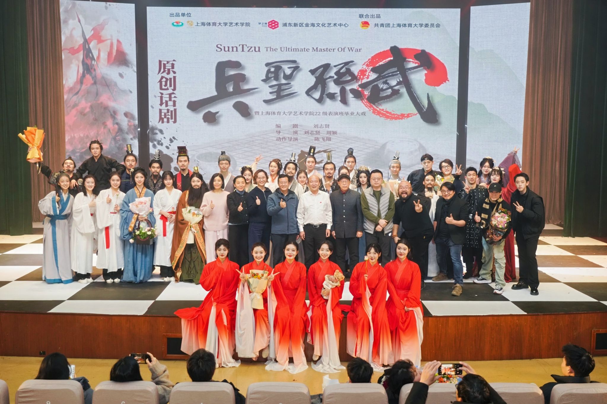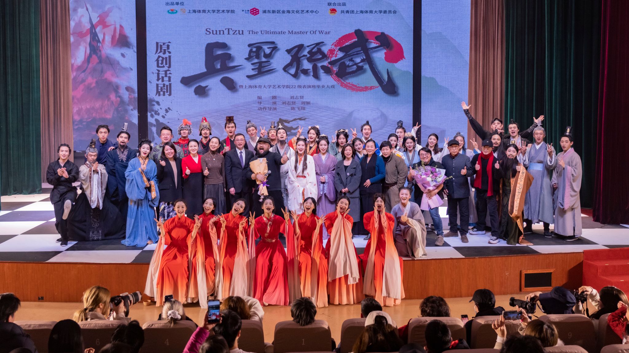 本网讯 2024年12月31日夜,在鲜花、掌声和呐喊声的海潮中,22级表演专业毕业大戏《兵圣孙武》于浦东新区金海文化艺术中心影剧院圆满落下帷幕,本轮演出为期4天,共计5场,由艺术学院院长韩春英担任制作人/统筹,刘志贤编剧,刘志贤、周颖共同执导,陈飞翔为动作导演。演员包括艺术学院、运动健康学院和体育教育学院在内的42名学生,其中还包括2名社会面艺术家。全剧高潮迭起,精彩纷呈,表现多元,描绘了孙武从逃离齐国开始成书《孙子兵法》,后又隐匿于历史的传奇故事。观众总人数超过2200人次,收获了社会各界的广泛关注与好评,并获得多个后续演出邀请及联合制作的橄榄枝,充分体现和检验了学校的育人成果。