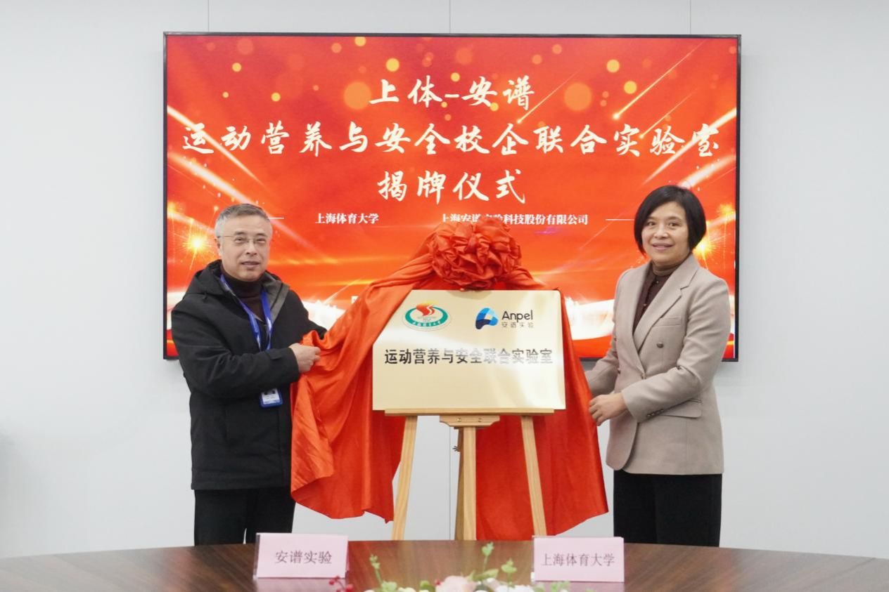 签约仪式后,毛丽娟校长与夏敏勇董事长共同为上体—安谱运动营养与安全校企联合实验室揭牌,标志着双方通过在运动营养与安全领域开展多元化的合作,共同推动在技术研发、产品研制、成果转化等多个领域的技术进步和协同共赢。