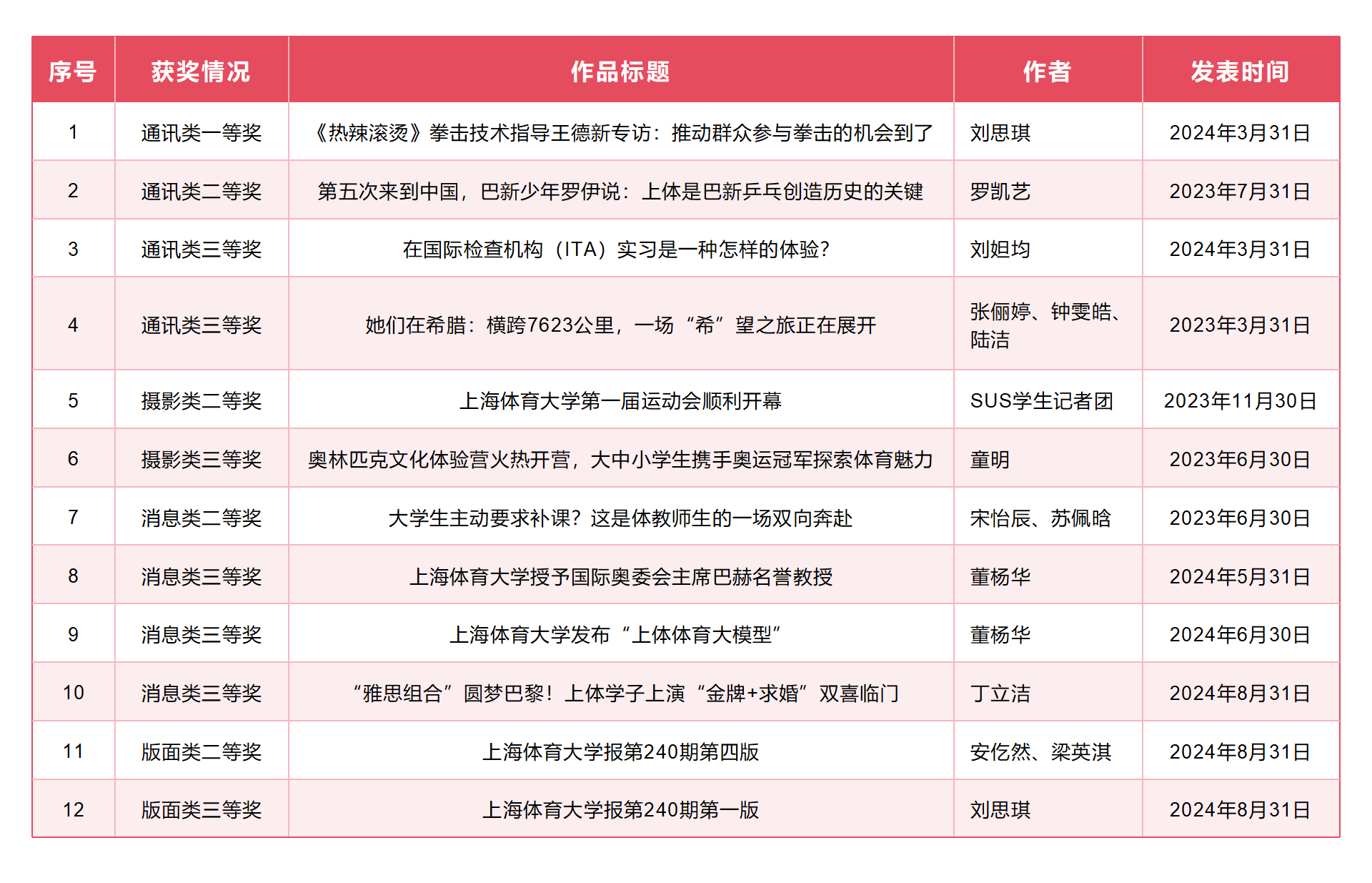 本网讯 2月20日上午,上海市高校新闻好作品交流会在复旦大学举行,会上揭晓2022-2024年新闻好作品名单,jnh今年会网站共有12件作品获奖。本次好新闻评选分为消息、通讯、评论、版面和摄影5大类,全市26所高校共448件作品参评,经专家评审,我校校报各类新闻作品质量得到广泛肯定,共斩获一等奖1项、二等奖4项、三等奖7项,覆盖了全部奖项类别。