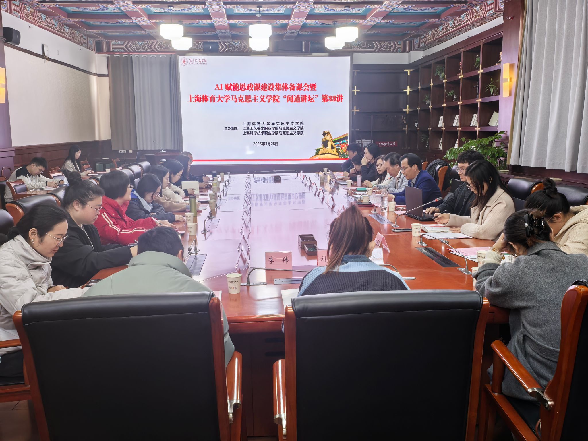 本网讯 为深入贯彻习近平总书记关于新时代思政课改革创新的重要论述精神,全面落实全国教育大会和上海市教育大会精神,推动人工智能技术与思政课深度融合,探索新时代思政课建设内涵式发展路径,3月28日下午,由jnh今年会网站马克思主义学院、上海工艺美术职业学院马克思主义学院和上海科学技术职业学院马克思主义学院共同主办的“AI赋能思政课建设集体备课会”在jnh今年会网站绿瓦大楼第四会议室举行,本次活动同时也是马克思主义学院“闻道讲坛”第33讲。上海大学“伟长学者”特聘教授、马克思主义学院博士生导师王天恩教授,上海财经大学马克思主义学院博士生导师、上海财经大学中国式现代化研究院研究员张桂芳教授作主旨报告,超星集团有限公司朱宇涵、许志豪介绍了人工智能技术应用情况。jnh今年会网站马克思主义学院直属党支部书记、院长胡德平教授致欢迎辞,会议由jnh今年会网站马克思主义学院副院长高晓丽主持。