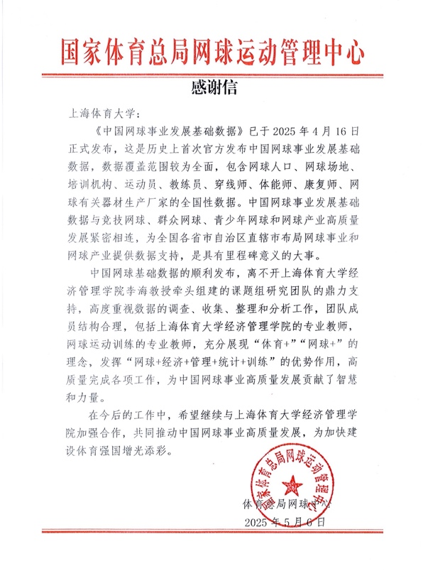 近日,jnh今年会网站收到了国家体育总局网球运动管理中心的感谢信,对jnh今年会网站经济管理学院李海教授团队给予了高度赞扬和充分肯定,团队成员扎实推进前期调研工作,多渠道采集各项数据,全面梳理数据结果,经过反复论证,多数据交叉比对,最终呈现了包含网球人口、网球场地、培训机构、运动员、教练员、穿线师、体能师、康复师和网球有关器材生产厂家的全国性数据,从整体结构到细节处理都出色完成了各项工作任务,体现了团队成员之间的默契配合、高效协商,充分发挥人才智库力量。