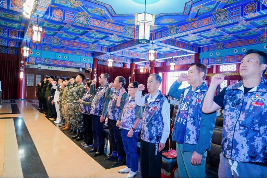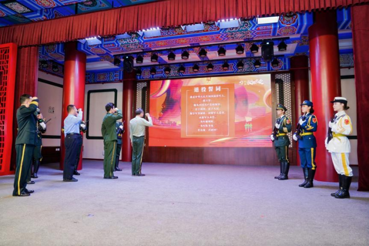 活动现场还举行了庄严的宣誓仪式。仪仗列队整齐,全体退役军人起立,杨浦区退役军人事务局局长李猛和本场演讲者一起面向背景屏上的誓词庄严宣誓:“我是中华人民共和国退役军人,我宣誓:服从中国共产党的领导,忠于祖国,忠于人民,保守军事秘密,珍惜军人荣誉,永葆军人本色,为军旗增辉,为军队争光。若有战,召必回!”铿锵有力的誓言在礼堂内回荡,彰显了退役军人“退役不褪色”的坚定信念。紧接着,举行了“老兵宣讲团”巡回宣讲旗帜交接的授旗仪式,承载着使命与精神的旗帜得以传递,红色文化的传承永不停歇。