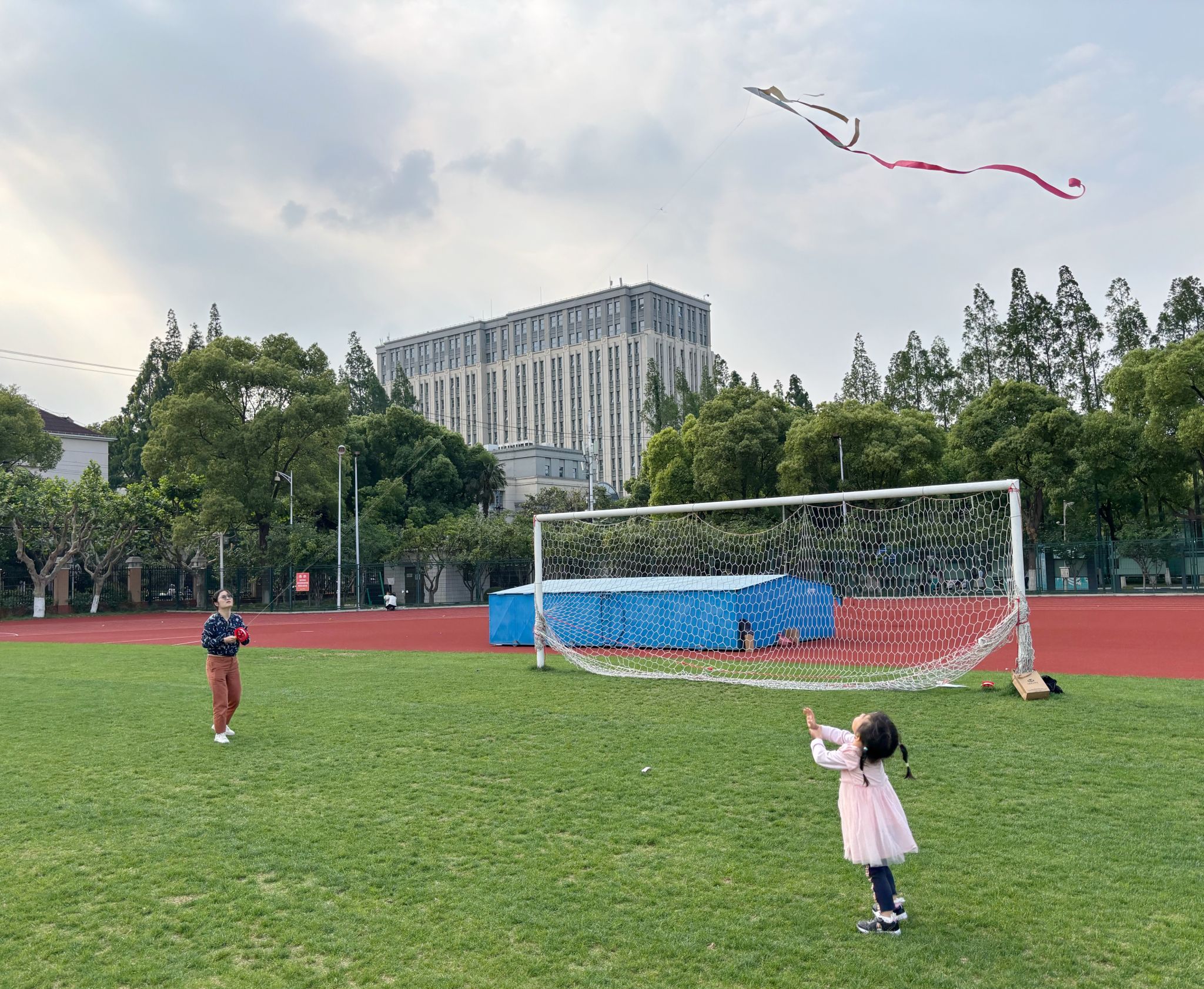 制作完成后,家长带领着孩子来到开阔的西田径场,认真聆听杨老师讲解放风筝的要领和安全知识,如怎么迎风站立、控制放线节奏等。家长们手把手教孩子调整角度、奔跑助飞,一个个精美风筝乘风而起,孩子们兴奋地欢呼雀跃,家长们在一旁鼓励、协助,亲子间的默契与欢乐在蓝天白云下无限蔓延。