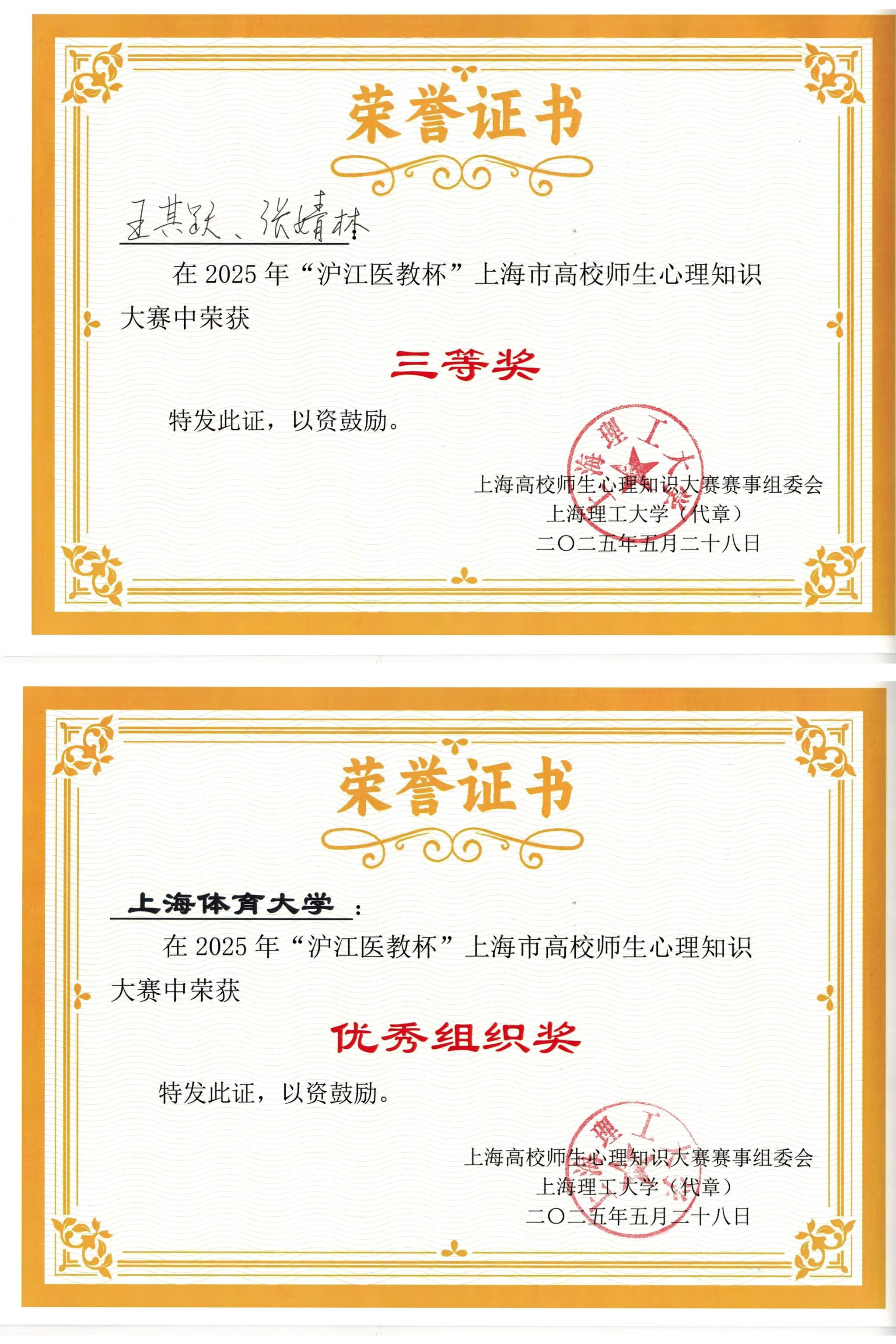 本网讯 2025年5月28日, 由上海市教委立项支持、上海理工大学承办的2025年“沪江医教杯”上海高校师生心理知识大赛决赛在上海理工大学军工路校区举办。我校选手辅导员王其跃老师和心理学院研究生张婧林,通过刻苦准备,在复旦大学、华东师范大学、上海大学、华东政法大学、上海师范大学等37支高校参赛队伍中脱颖而出,顺利晋级16强,闯入决赛。在决赛中不畏强手,稳扎稳打,最终跻身前十,荣获三等奖;jnh今年会网站荣获优秀组织奖。
