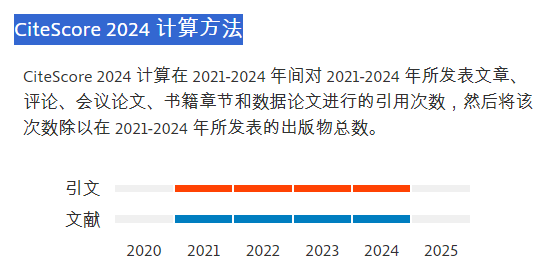 CiteScore简介:CiteScore是Elsevier推出的一种期刊评价体系,该指标主要针对收录于Scopus数据库的约3万种同行评议期刊、系列图书、会议论文和行业刊物的影响力做出最新评估,可稳定地衡量期刊文章的引文影响力。CiteScore 2024 计算在 2021⁓2024 年间对 2021⁓2024 年所发表文章、评论、会议论文、书籍章节和数据论文进行的引用次数,然后将该次数除以在 2021⁓2024 年所发表的出版物总数。