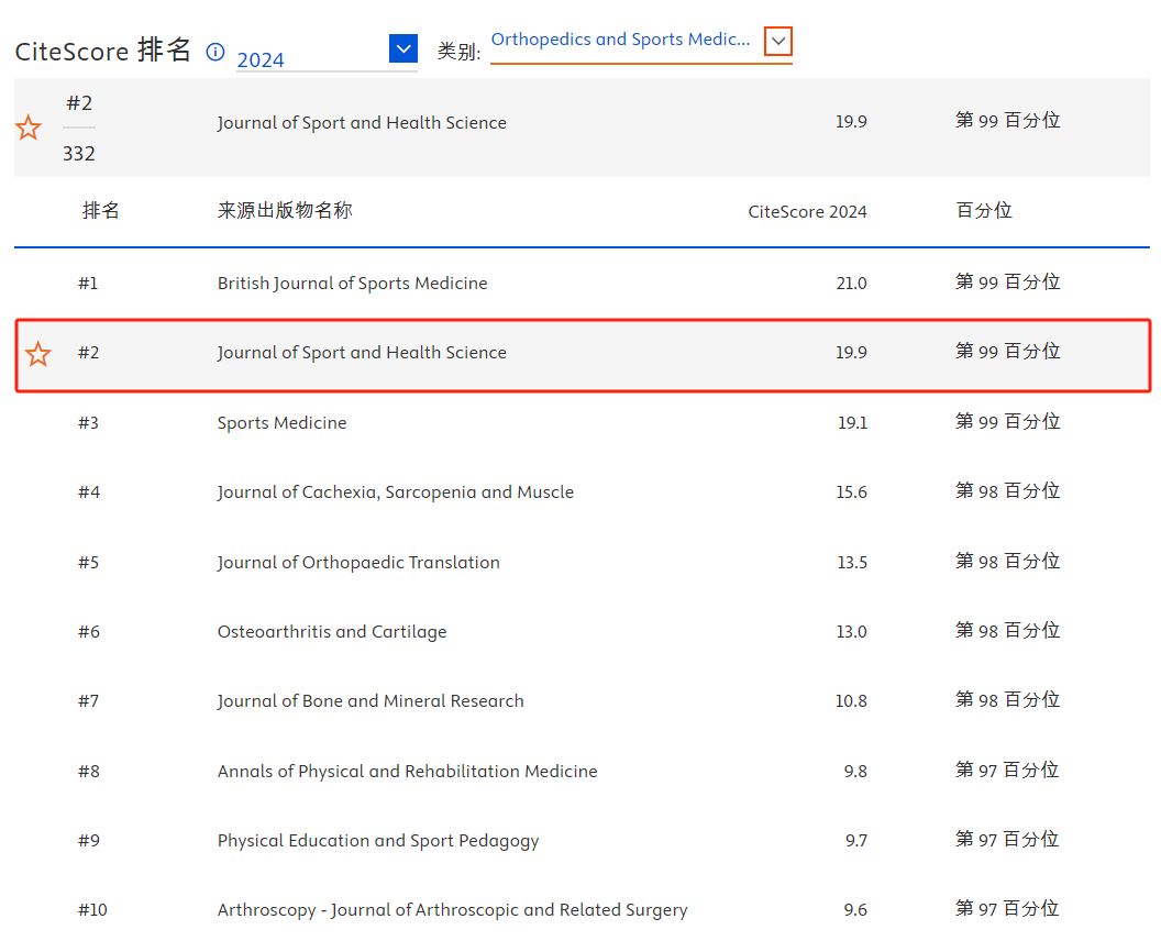 JSHS在骨科、运动医学(Medicine: Orthopedics and Sports Medicine)学科收录的332种期刊中排名第二(2/332),稳居前1%(去年为3/321,前1%)。