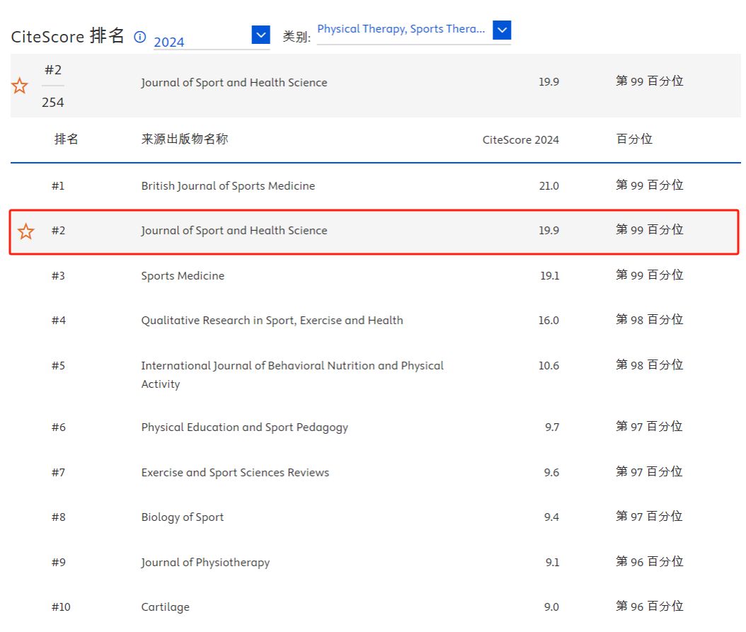 JSHS在物理治疗、运动疗法、康复(Health Professions: Physical Therapy, Sports Therapy and Rehabilitation)学科收录的254种期刊中排名第二(2/254),进入前1%(去年为3/247,前2%)。