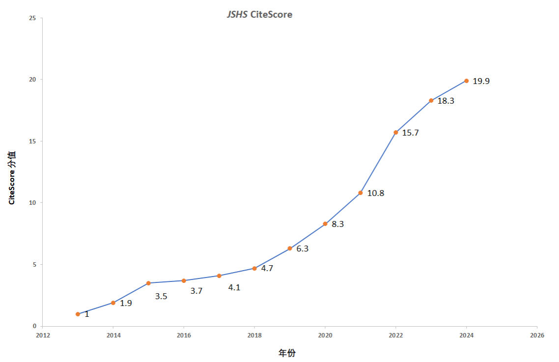 在学校党政领导的高度重视下,在相关职能部门的通力配合下,在编委团队和审稿专家的严格把关下,在广大作者和读者的笃定支持下,JSHS在运动医学与卫生健康等相关领域的学术影响力持续提升,CiteScore分值从1稳步攀升至19.9。展望前路,JSHS将始终坚守学术至上的办刊初心,紧密围绕国家重大需求精准发力,推动学科交叉融合与创新发展。在新时代浪潮下,积极拥抱 AI 技术,持续优化审稿机制、完善学术服务体系、强化期刊品牌建设、多维度拓展国际影响力,推出更多优质学术成果助力全球运动和健康事业发展。