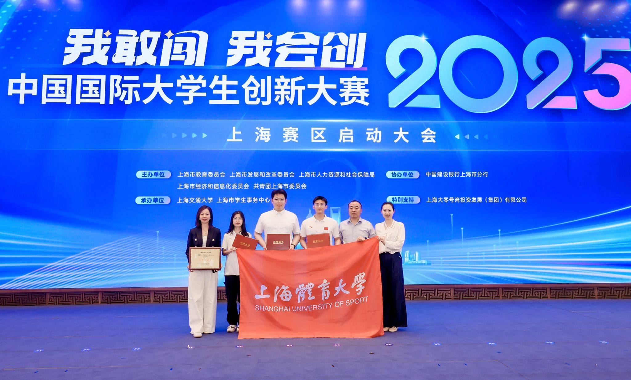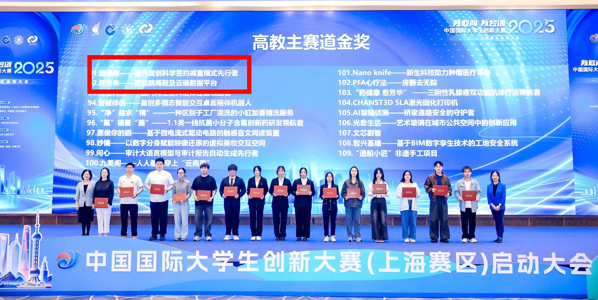 高教主赛道金奖项目《超享瘦——国内首创科学签约减重模式先行者》《跃未来——智能跳绳鞋及云端数据平台》上台领奖