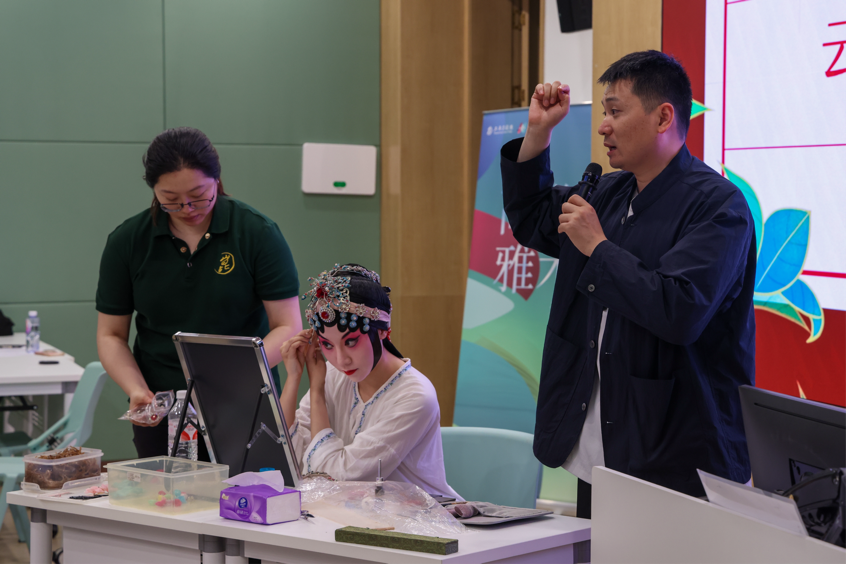 6月12日晚,“云鬓花颜 朱唇轻点”昆曲妆造艺术工作坊带领师生走进戏曲后台的奥秘。活动特邀专业昆曲化妆师现场示范,从“生旦净丑”的行当区分到“贴片子”“戴头面”的化妆技艺,系统展示了昆曲艺术的审美体系与工艺精髓。师生们近距离观摩了从打底、勾脸到佩戴点翠头面的完整流程,深刻体会到“无声不歌,无动不舞”的昆曲艺术背后所蕴含的匠心精神。