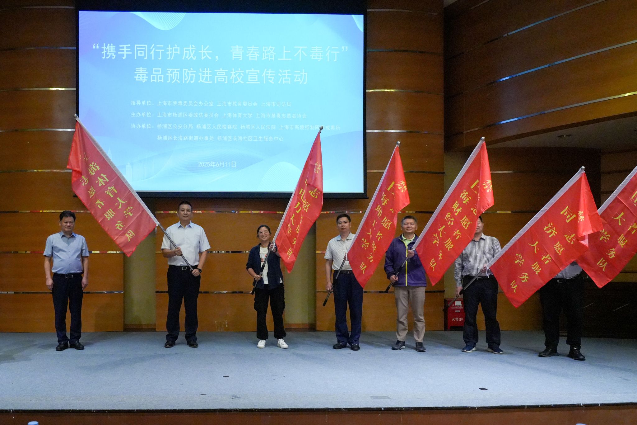 市委政法委毒品预防处为高校禁毒志愿者队伍授旗。