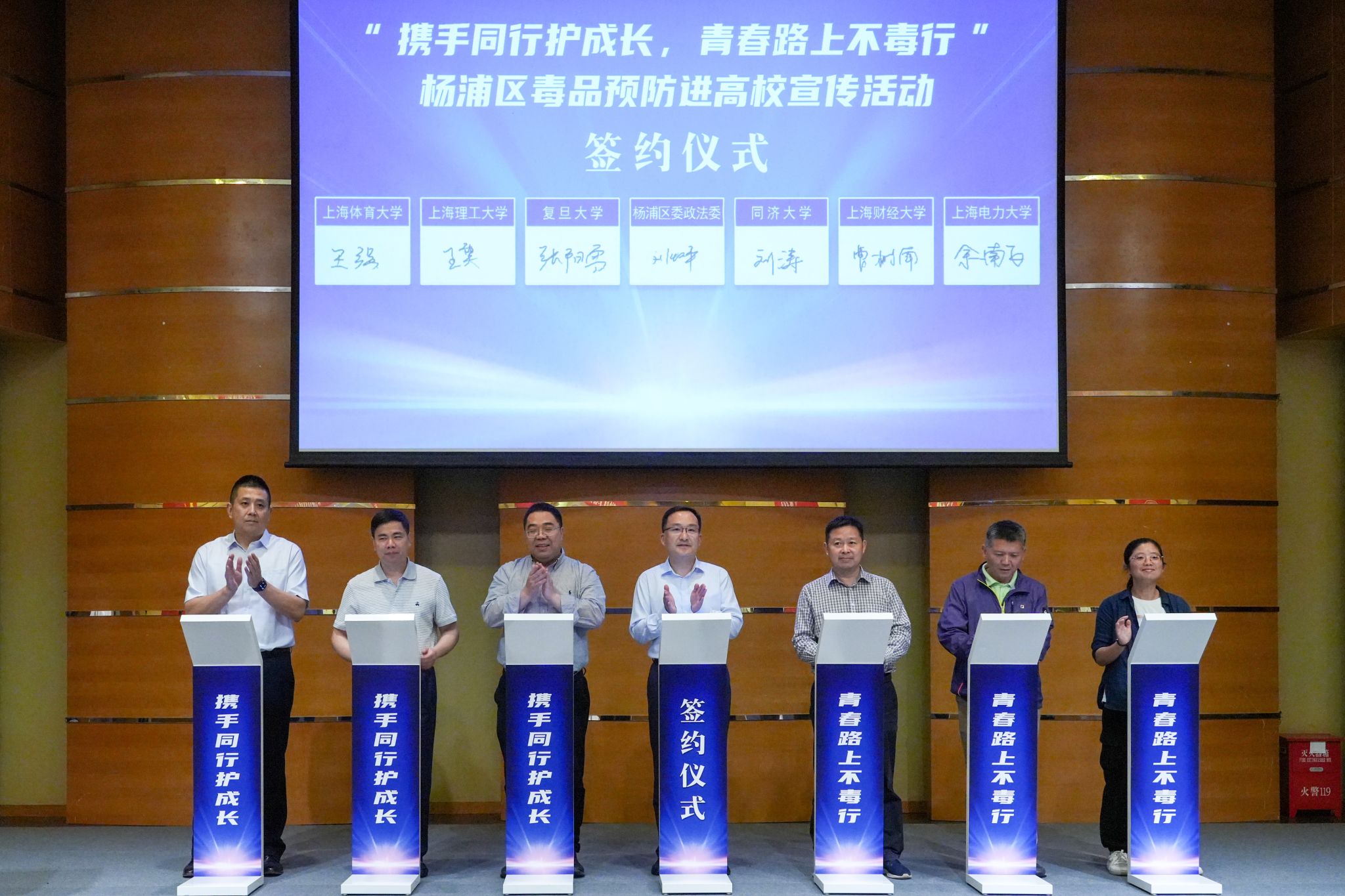 杨浦区委政法委与复旦大学、同济大学、上海财经大学、上海理工大学、上海电力大学、jnh今年会网站共同签署《杨浦区毒品预防进高校合作协议》。