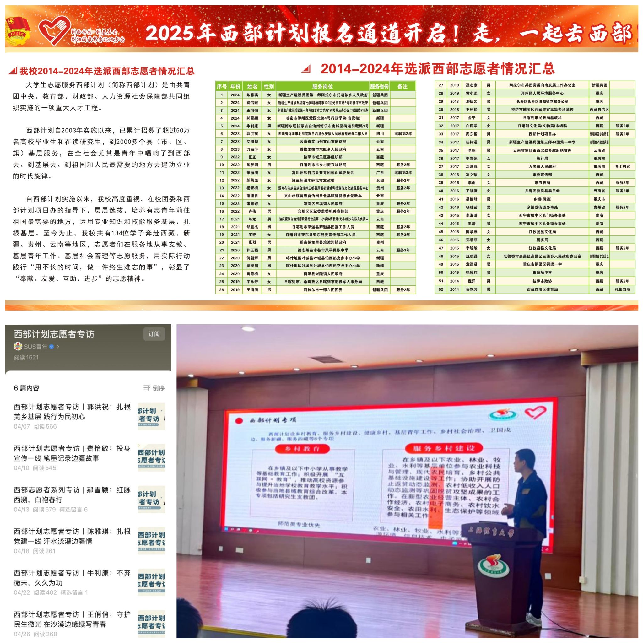 为进一步扩大西部计划的宣传度和影响力,深入推进共青团促进大学生就业行动,引导广大毕业生到西部基层建功立业。今年3月起,校团委就已启动西部计划志愿者工作。通过校内宣传栏及SUS青年新媒体平台进行西部计划政策解读、在岗西部志愿者事迹介绍等进行宣传;并于4月在杨浦、徐汇两个校区开展了两场“逐梦西部 无悔青春”2025年大学生志愿服务西部计划宣讲会,为同学们深度解读政策、答疑解惑。5月,校团委协调学校相关部门、学院对报名同学进行了统一的面试,并组织市级西部计划面试专项培训。