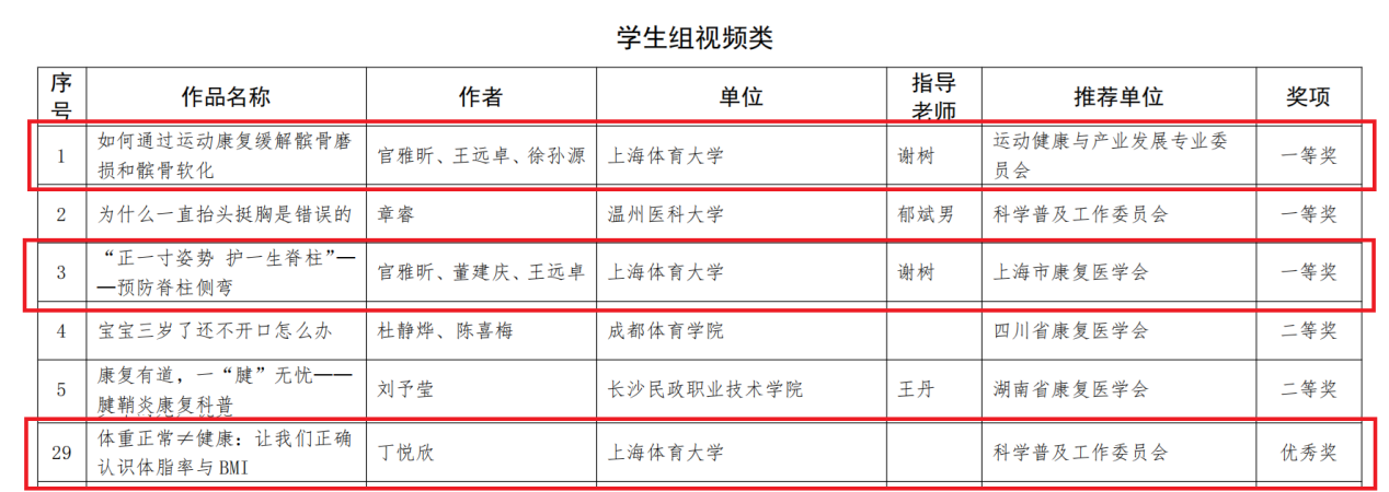 由我校运动健康学院谢树老师指导、23级本科生官雅昕、董建庆和24级本科生王远卓、徐孙源等人创作的2个视频参赛作品《如何通过运动康复缓解髌骨磨损和髌骨软化》、《“正一寸姿势 护一生脊柱”——预防脊柱侧弯》均获得学生组视频类一等奖,运动健康学院22级本科生丁悦欣创作的视频作品《体重正常≠健康:让我们正确认识体脂率与BMI》获得学生组视频类优秀奖。