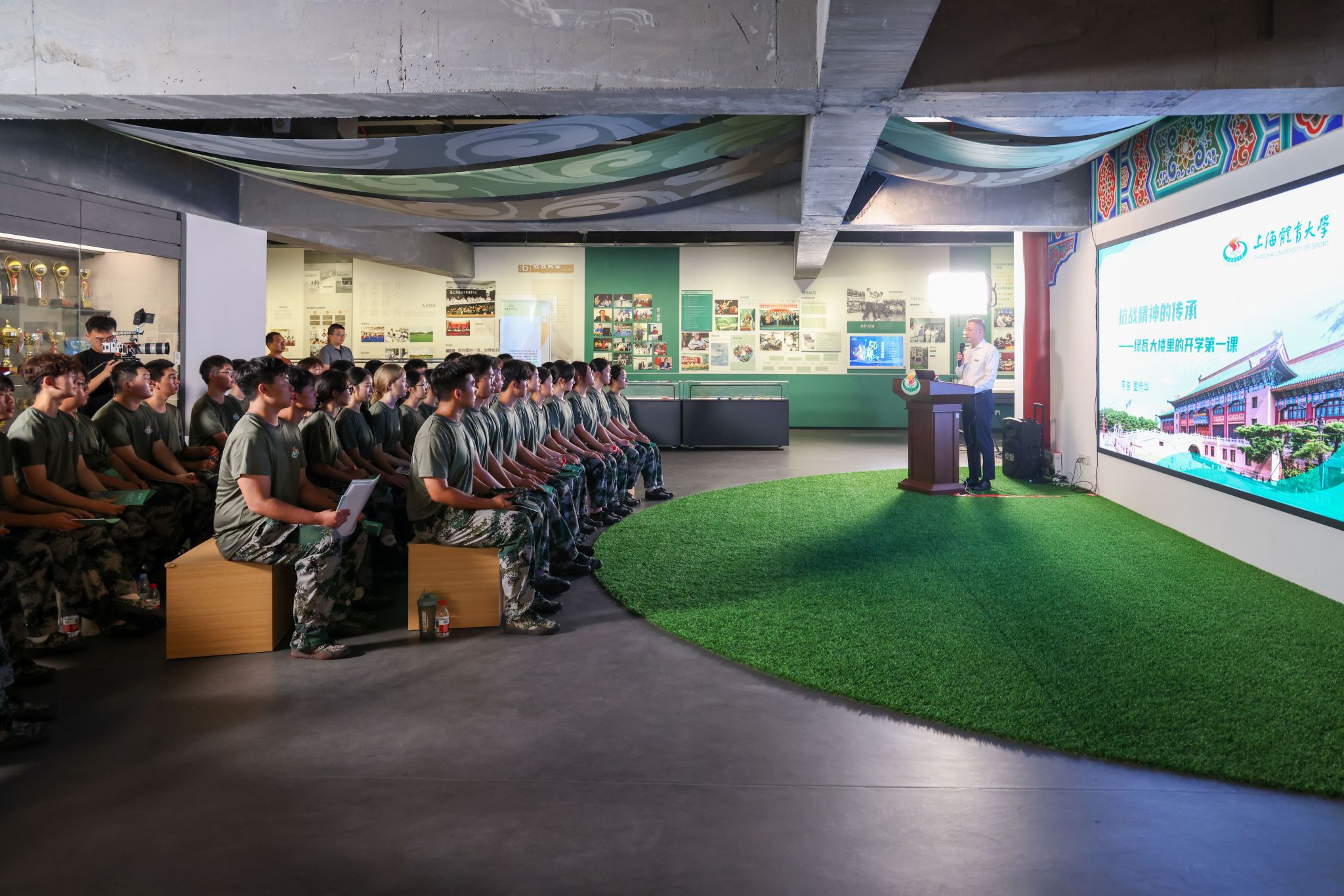 随后,同学们来到位于绿瓦大楼四楼的体育教育博物馆第三展厅,聆听党委书记李崟的课堂讲授。“绿瓦大楼的伤痕,是国耻的印记;先辈们的抗争,是精神的灯塔。”在随后的课堂讲授中,李崟通过一个个体育人抗战故事,串联起伟大抗战精神与中华体育精神的共鸣:中国首位奥运选手刘长春拒为伪满洲国效力,“东亚球王”李惠堂以义赛募捐抗日,撑杆跳运动员符保卢、足球“国脚”陈镇和、“亚洲第一拳王”靳贵第弃赛从军、为国捐躯……这些“体育救国”的践行者,用气节与牺牲诠释了爱国情怀。