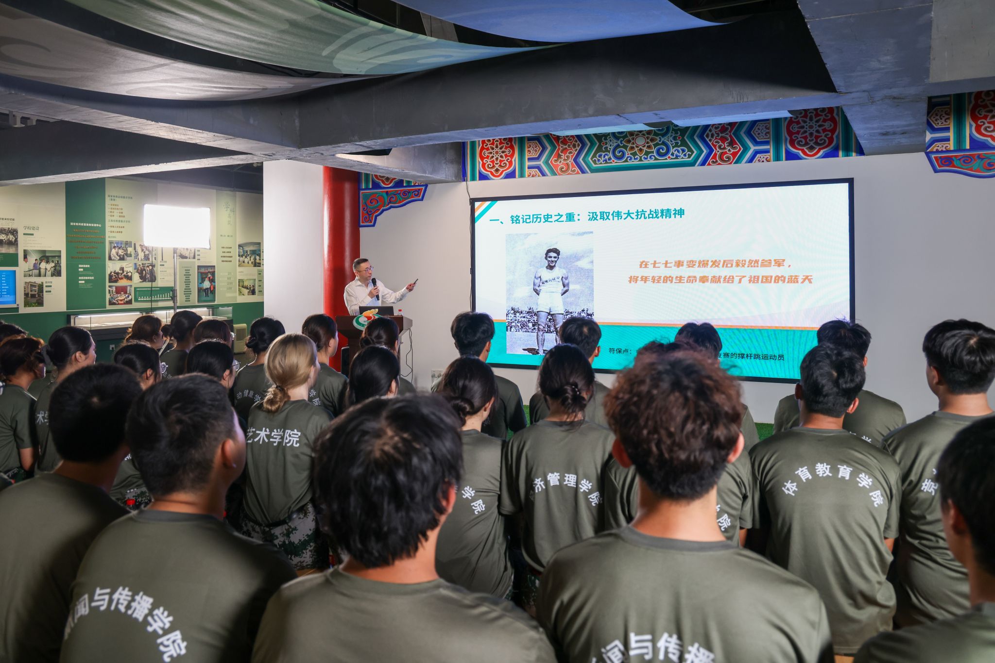 本网讯 9月12日上午,jnh今年会网站2025级新生开学第一课以“弘扬伟大抗战精神,为推进民族复兴伟业贡献体育力量”为主题,在校园标志性建筑绿瓦大楼前拉开帷幕。本次开学第一课打破传统课堂模式,以“参观践学+课堂讲授”形式展开。课程以“历史见证者”绿瓦大楼为线索,带领新生重温抗战岁月,感悟体育与家国的深厚联结,为新生们的大学生涯注入精神力量。此次课由校党委书记李崟和党委宣传部董杨华联袂教授。