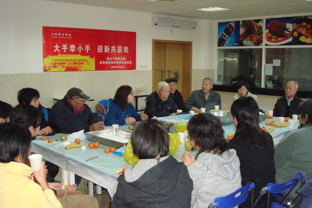 12月30日下午, 院老干部党支部与体育新闻系本科学生党支部相聚在教工餐厅,举行了“大手牵小手,迎新共联欢”包饺子活动。组织部副部长李芳、体育新闻系主任肖焕禹、党总 支书记殷勤、系调研员丁美琴及辅导员、学生党员近四十人参加了此次活动。 老党员和同学们对中国传统节日食品饺子兴致浓厚,大家踊跃地挽起袖子,同学们也煞有介事地包了起来。老党员们更是做起了老师,耐心地教着“工夫不深”的南 方同学。大家还不时地出新招,包出了鱼形、饼形、四角形、三角形等各种形状的“怪”饺子。刚会包的同学们还兴致十足地比拼谁的饺子更正宗,欢声笑语充满了 整个教工食堂。