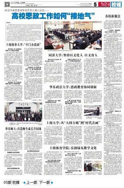 本网讯 4月27日,《中国青年报》中青在线以《高校思政工作如何‘接地气’》为题,报道包括我校在内的十余所沪上高校思政工作开展的新思路、新方法。我校教师教学发展中心长期开展了教师教学培训、研究、资源建设、督导、测评等工作,搭建“五位一体”平台(体育百家、绿瓦教学讲堂、上体公开课、上体教学工作坊、绿瓦新视野),传播上体品牌,弘扬绿瓦教学文化,致力于提升教师的专业能力,提高教师育德能力与德育意识。