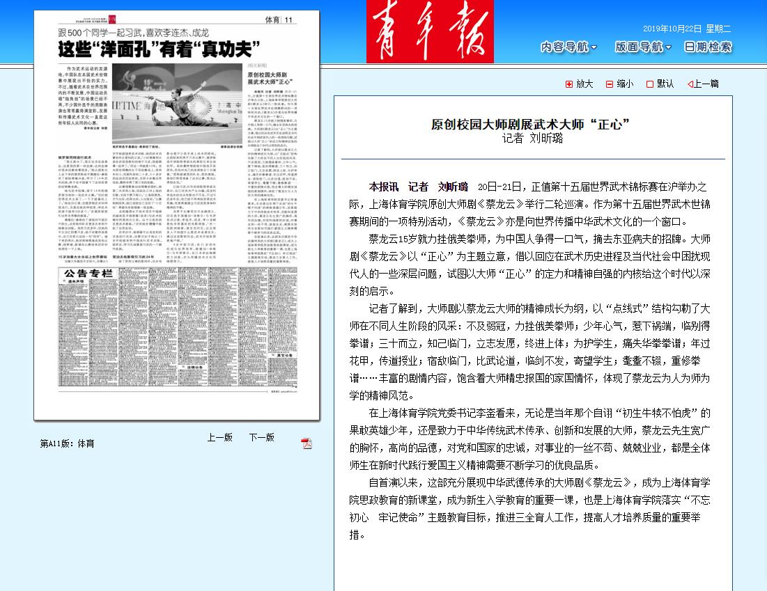 自首演以来,这部充分展现中华武德传承的大师剧《蔡龙云》,成为上海体育学院思政教育的新课堂,成为新生入学教育的重要一课,也是上海体育学院落实“不忘初心 牢记使命”主题教育目标,推进三全育人工作,提高人才培养质量的重要举措。