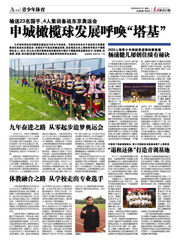 九年的时间先后向国家队输送过10名女子运动员,目前还有四名女子运动员正在国家集训队备战东京奥运会!这看似不可思议的输送成果,真实地发生在上海体育学院女子橄榄球队身上。近日,在山东日照开展奥运备战集训的中国女子橄榄球奥运集训队中,谷瑶瑶、刘潇倩、凌晨、郑文燕4名国手就是来自上海体育学院的学生运动员。 本版撰稿本报记者丁荣